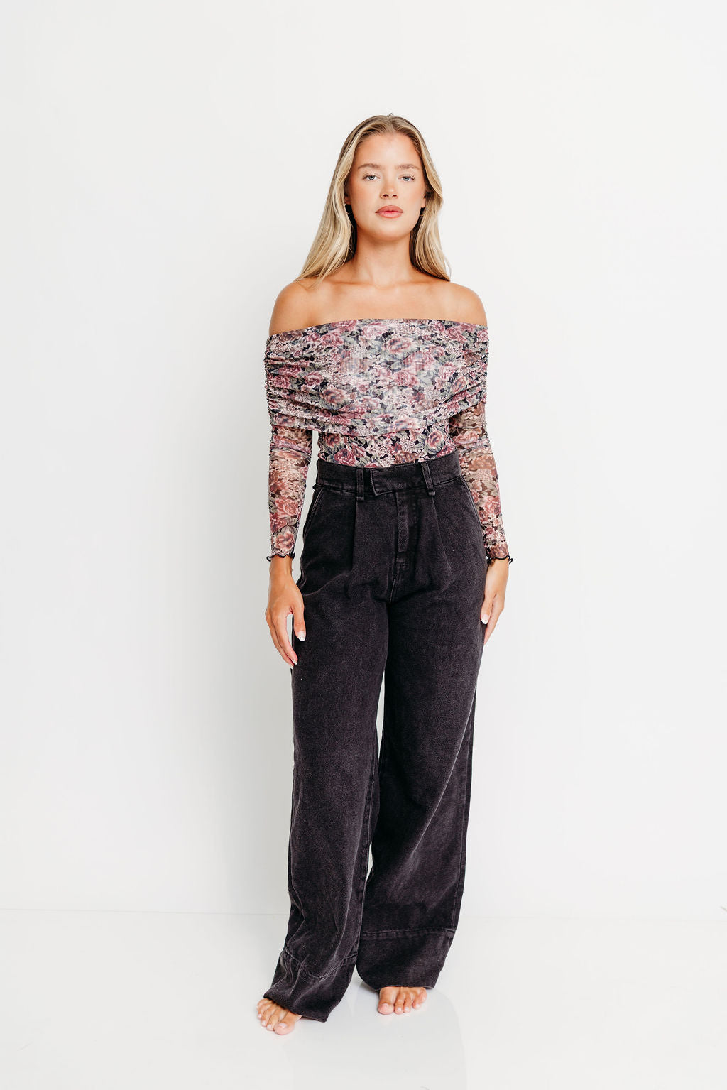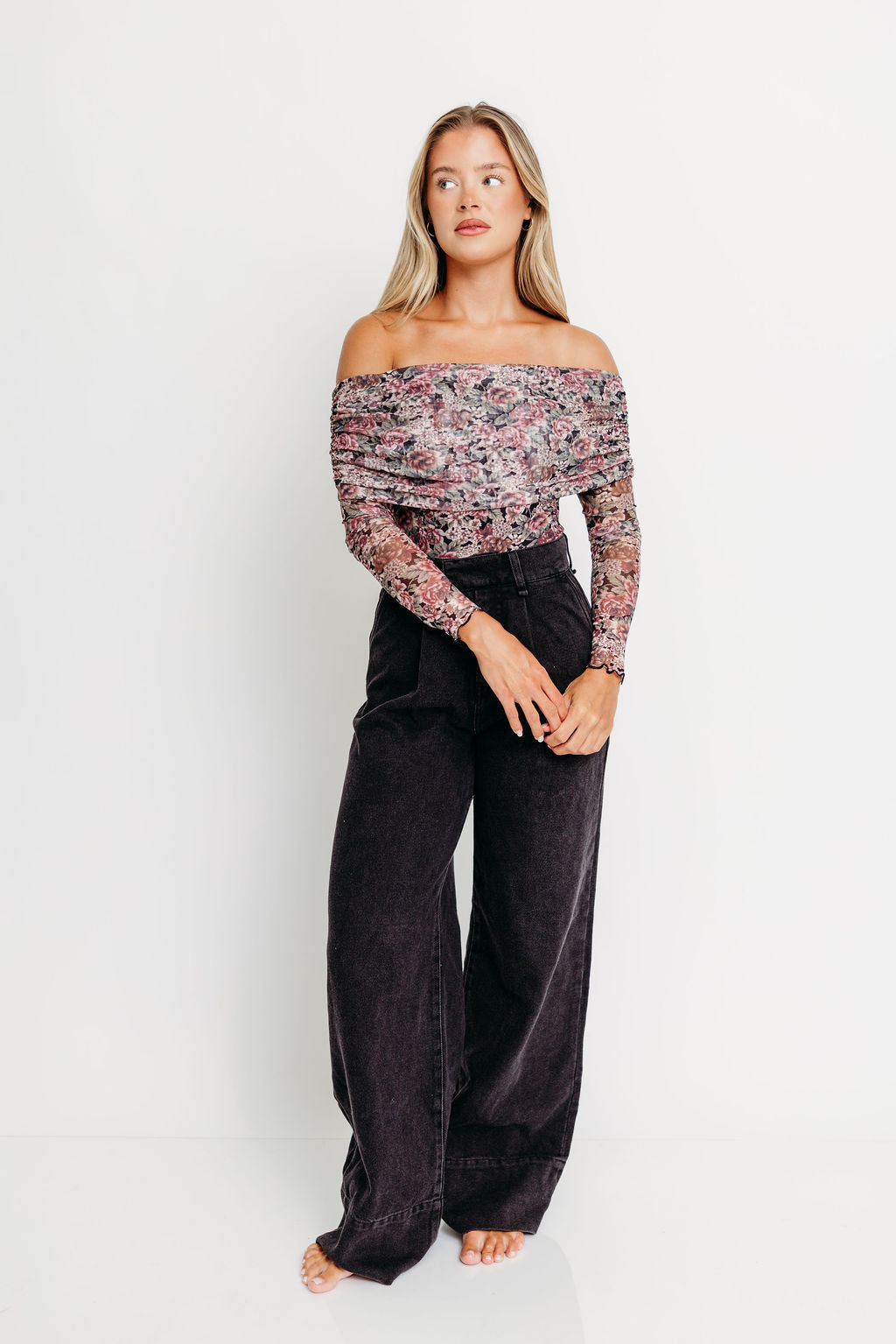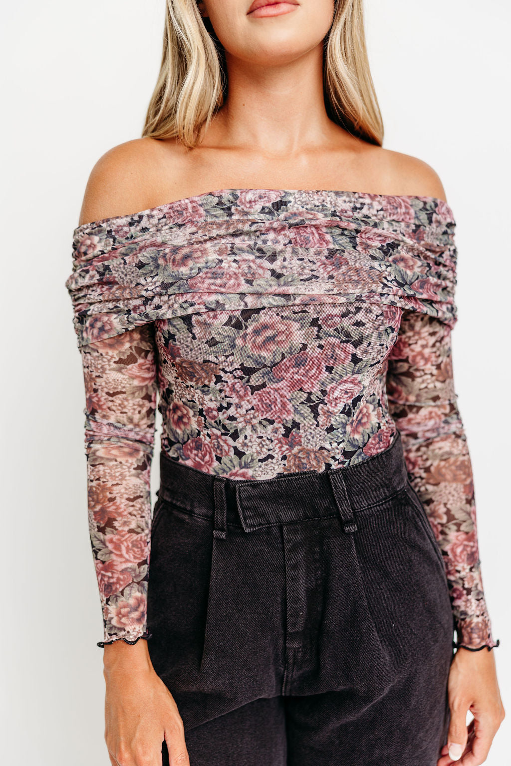 GARMENT DETAILS: Premium mesh bodysuit in a floral print design, with off-the-shoulder neckline and oversized, fold-over collar. Features long sleeves with thumbhole cuffs, thong snap closure, and partial lining.