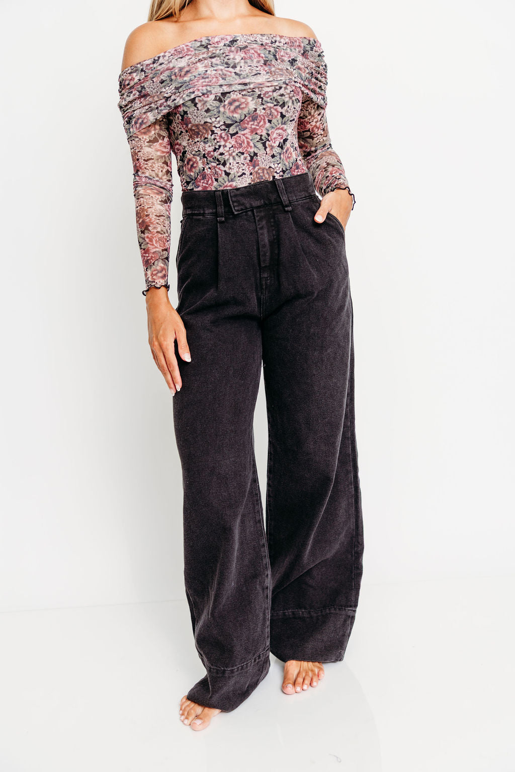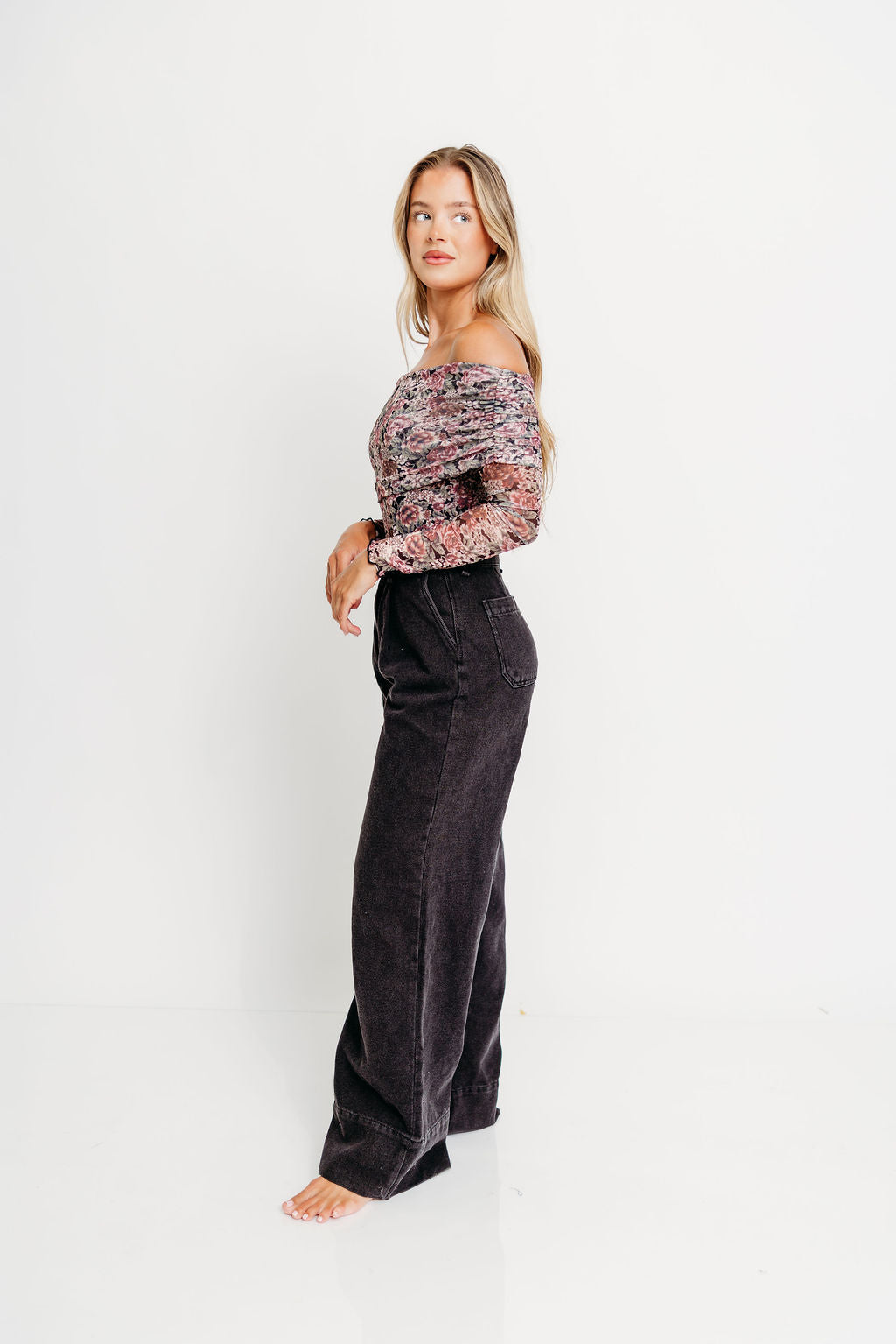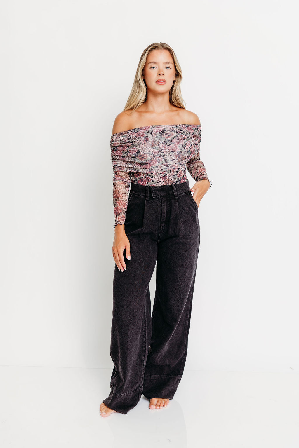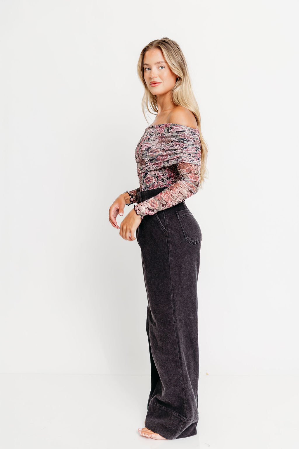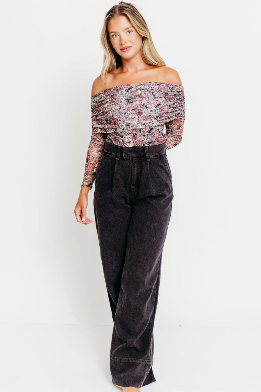 Meet the Scheana Bodysuit, a unique and feminine top you'll definitely want for your fall and winter wardrobe! Crafted from a floral-print mesh, the Scheana features an off-shoulder neckline and folded collar, plus thumbhole cuffs to keep the sleeves from riding up! Pair with your favorite velvet trousers or denim for a sophisticated yet comfortable style.