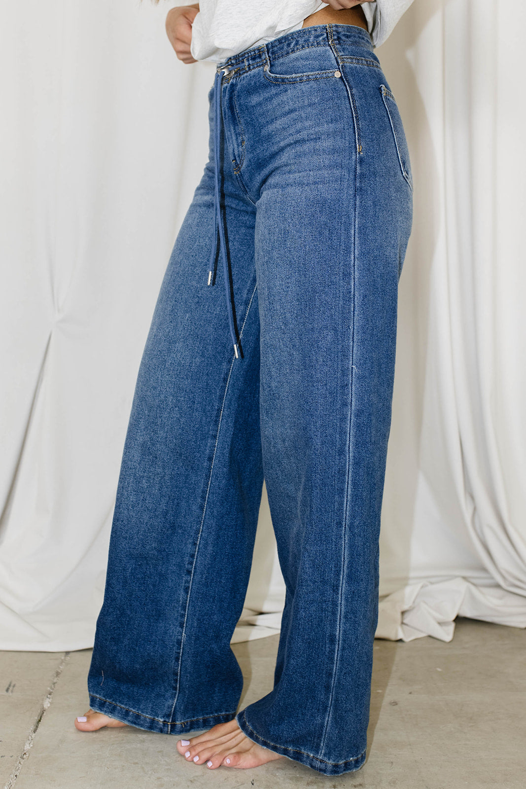 GARMENT DETAILS: Wide-leg denim jeans with a unique drawstring waistband detail.