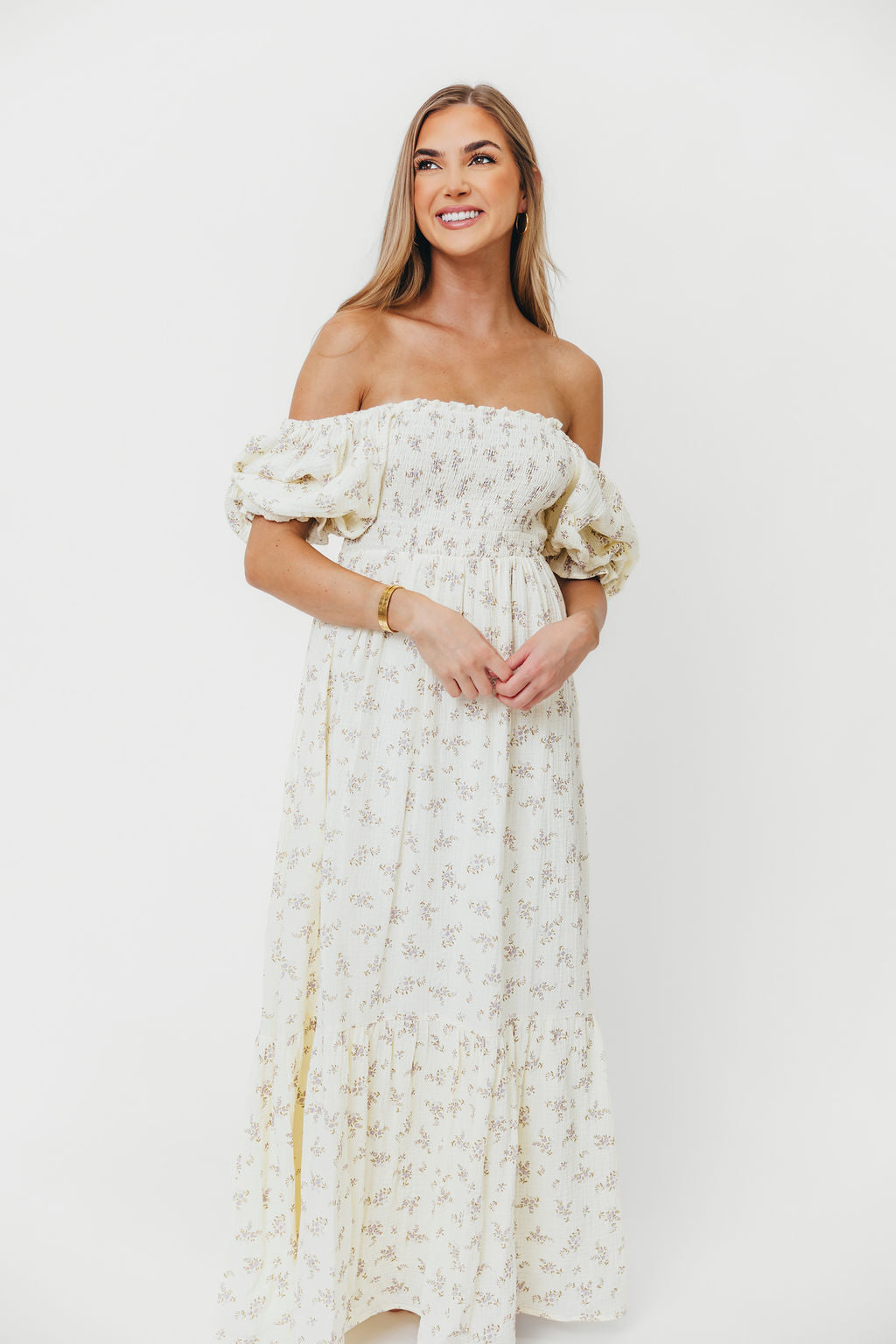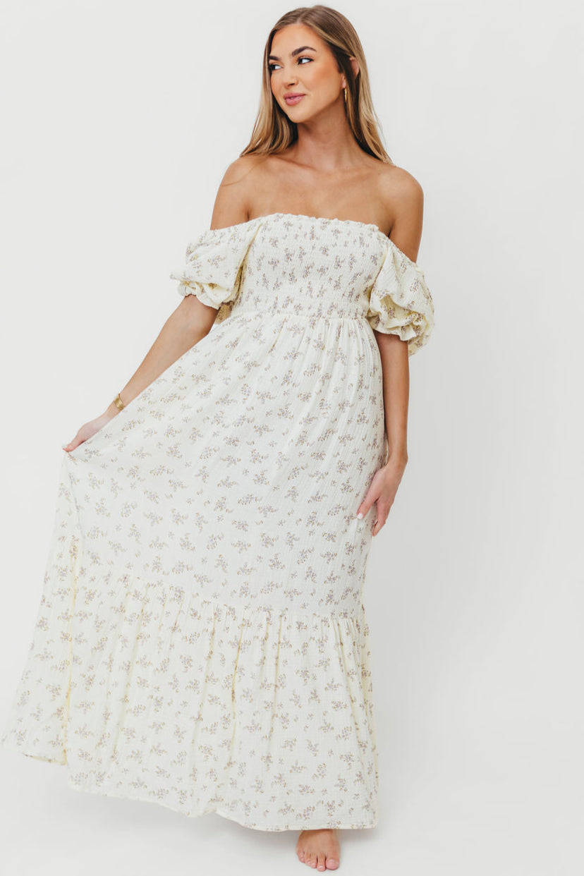 GARMENT DETAILS: Lightweight maxi dress with square neckline, short puff sleeves, and fully smocked, stretchy bodice. Features an elegant floral print and side pockets. Elasticated neckline can be worn on or off the shoulders.