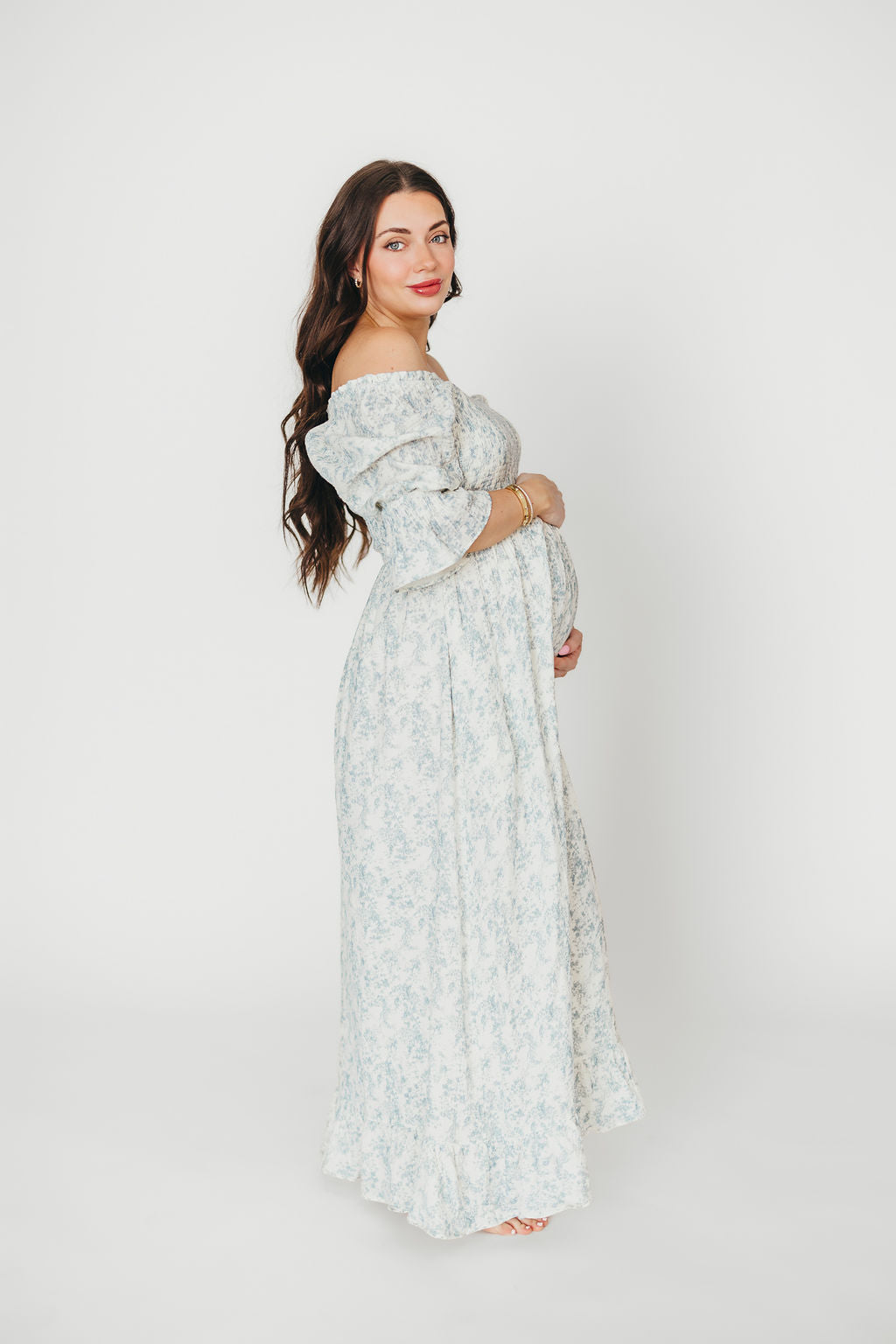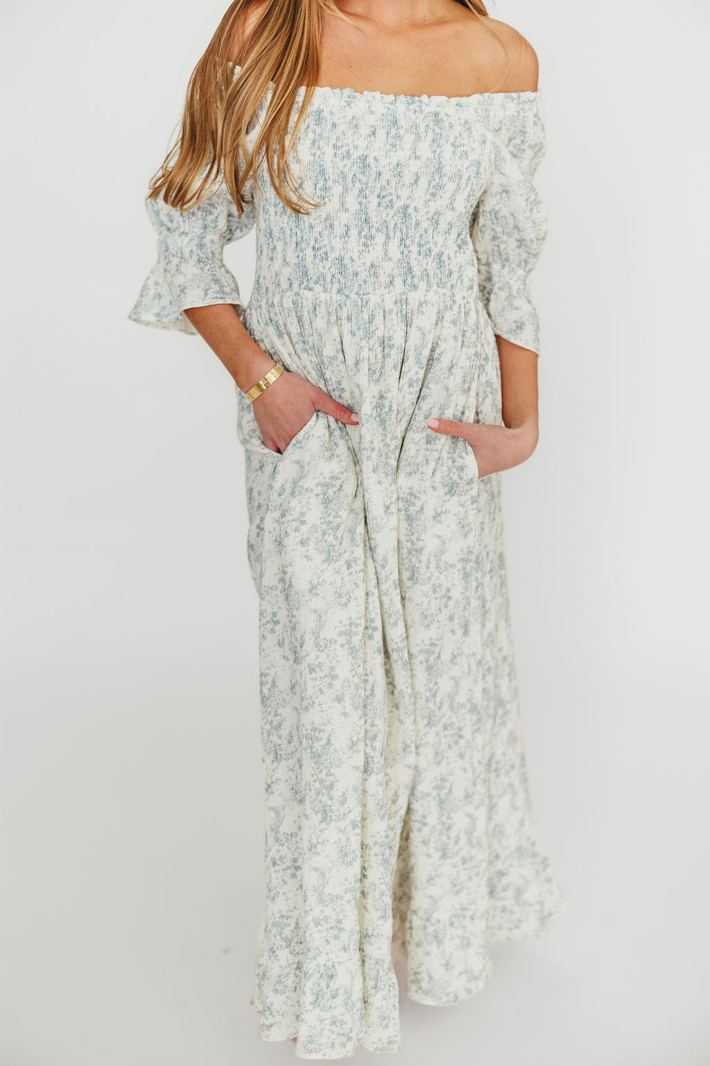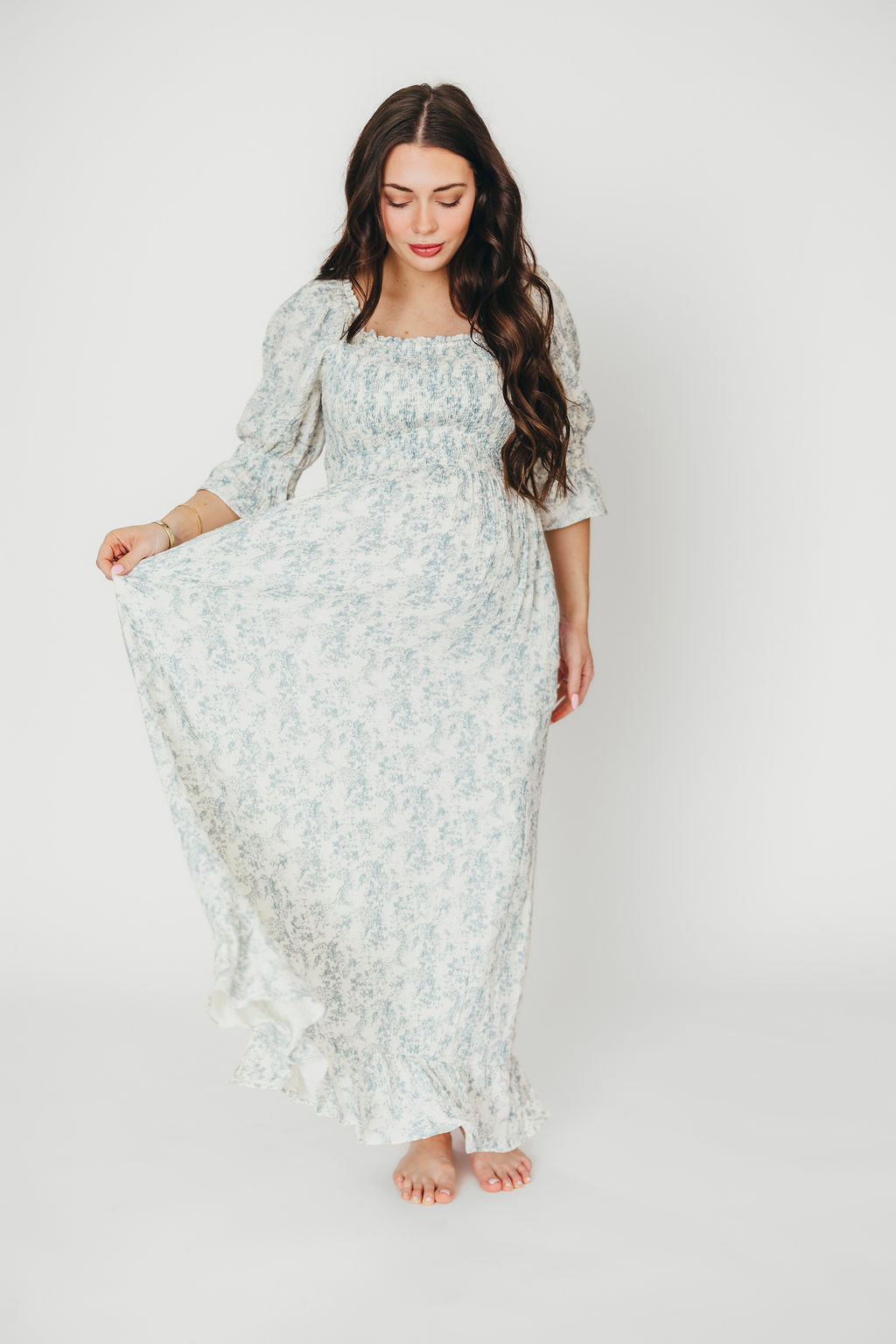 GARMENT DETAILS: Elegant, lightweight maxi dress in a darling floral print, with stretchy neckline that can be worn on or off the shoulder. Features 3/4 length puffed sleeves with ruffle, and a stretchy, smocked bodice.