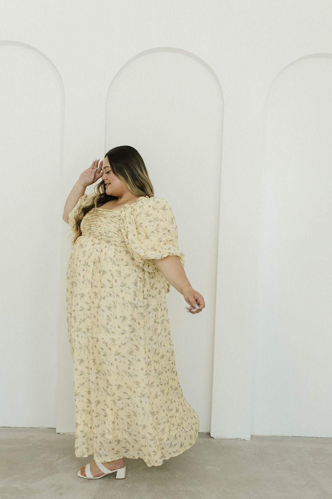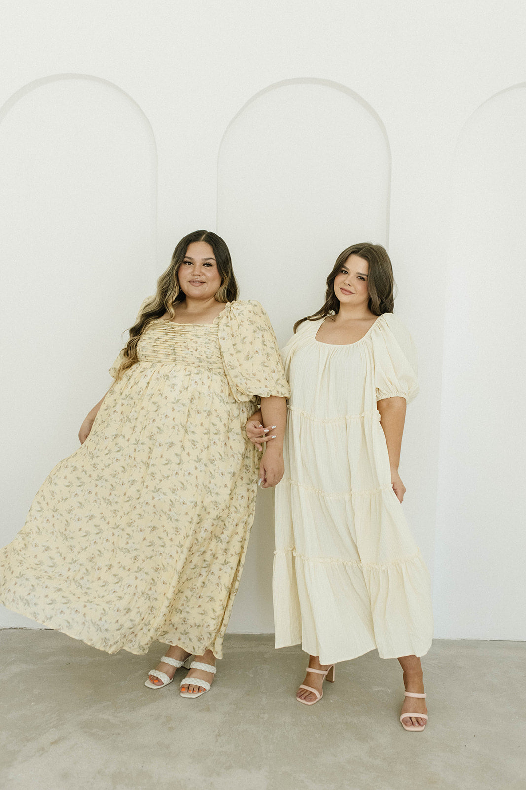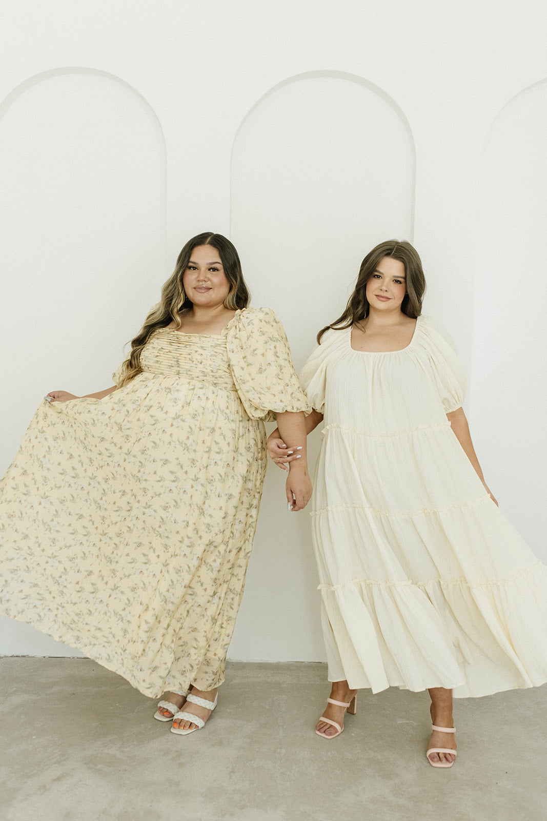 Look no further for your next wedding/baby shower/special event dress! The Melody Maxi Dress is the perfect combination of elegant and sweet. This lovely number has ALL the details: square neckline, balloon sleeves, and a jaw-dropping self-tie sash that makes the <chef's kiss> of bows. This gem is guaranteed to become a treasured addition to your wardrobe!
