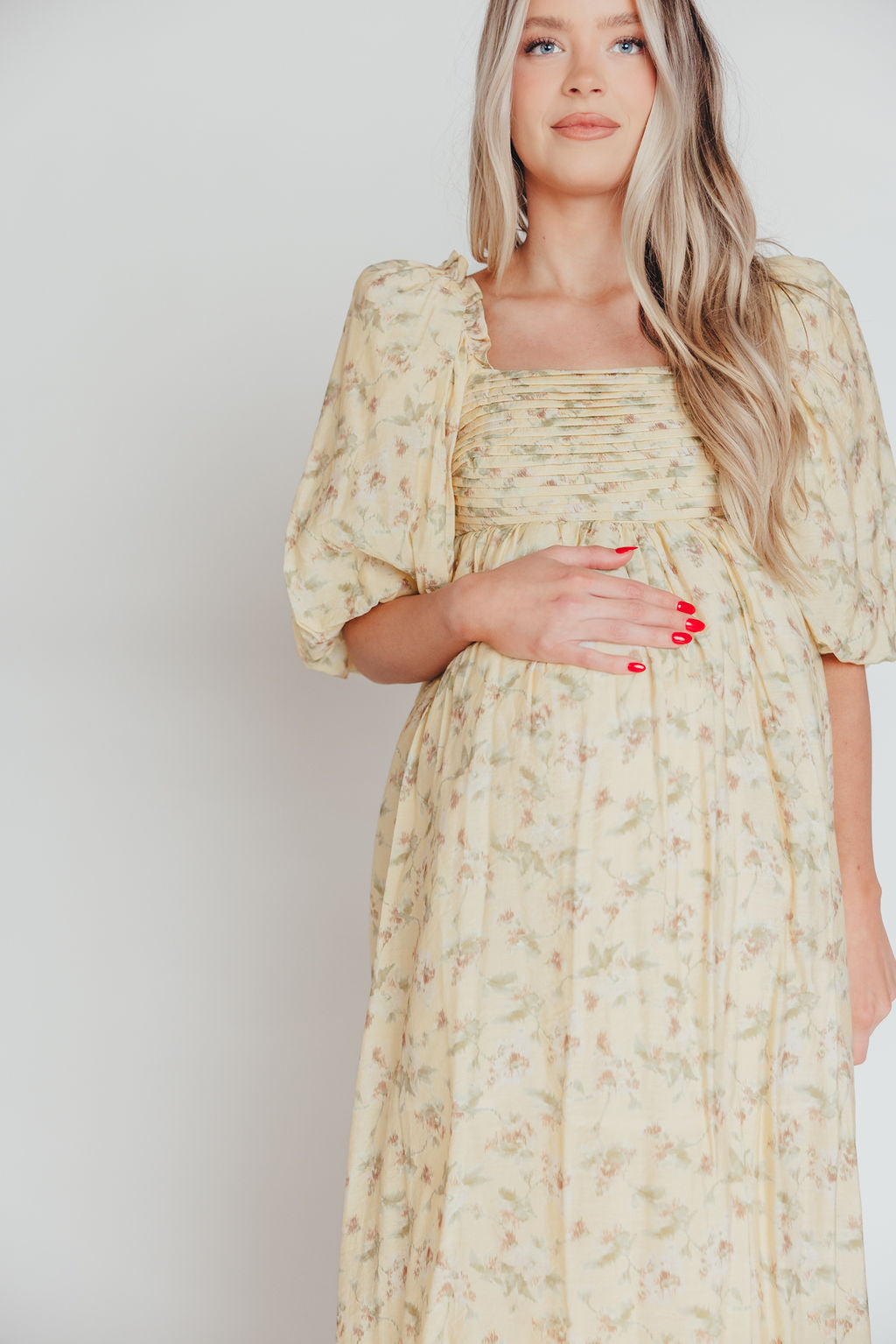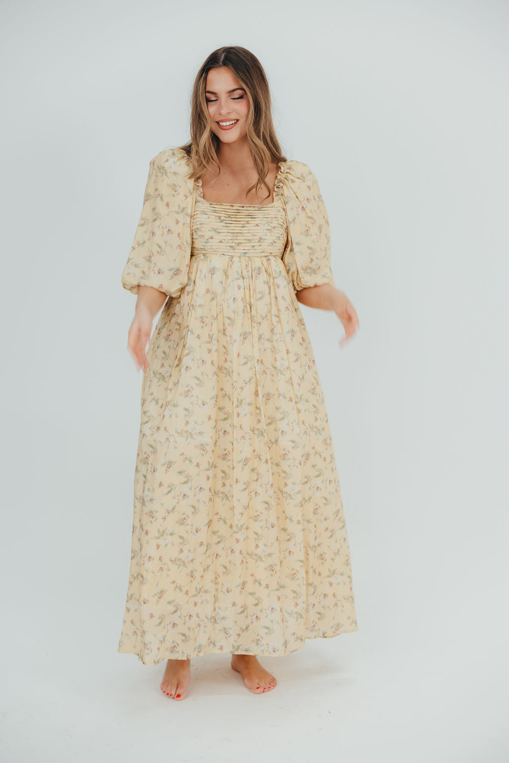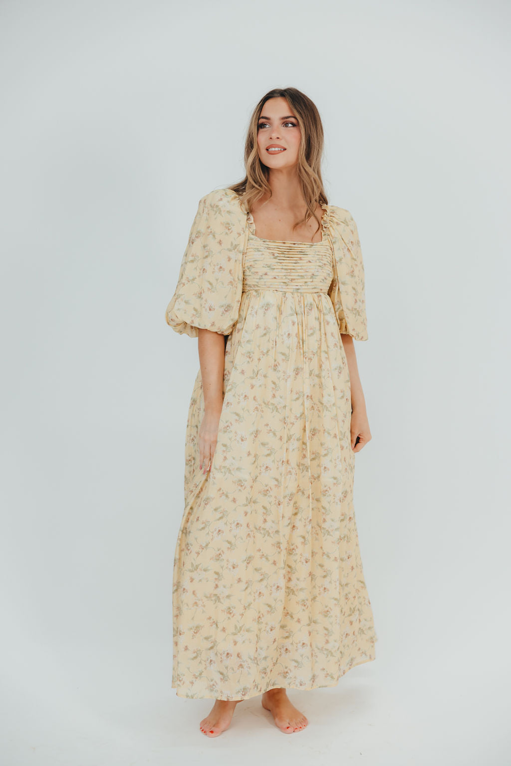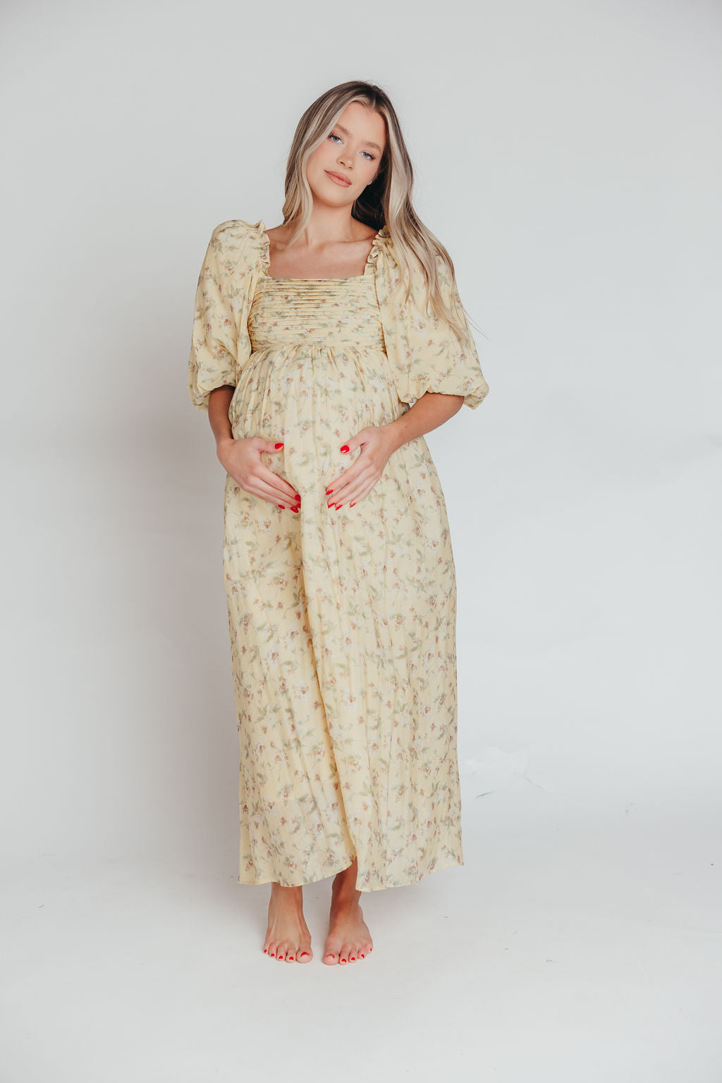 Melody Maxi Dress with Pleats and Bow Detail in Yellow Floral - Bump Friendly & Inclusive Sizing (S-3XL)