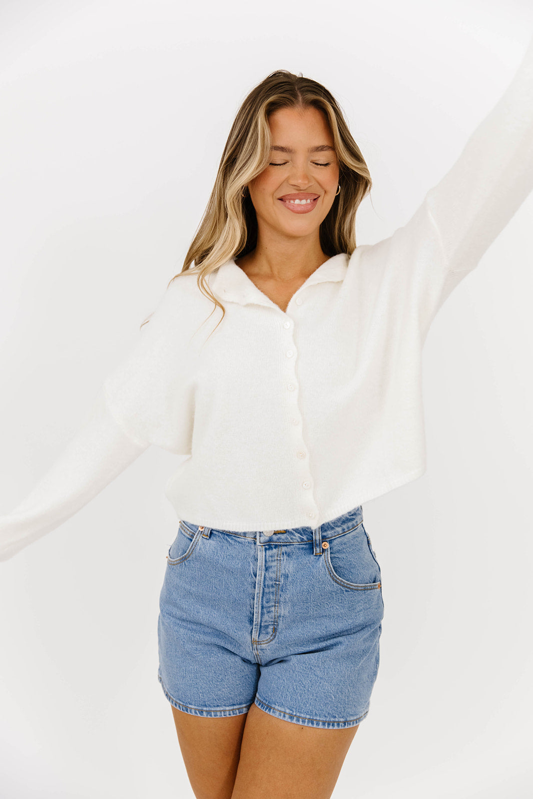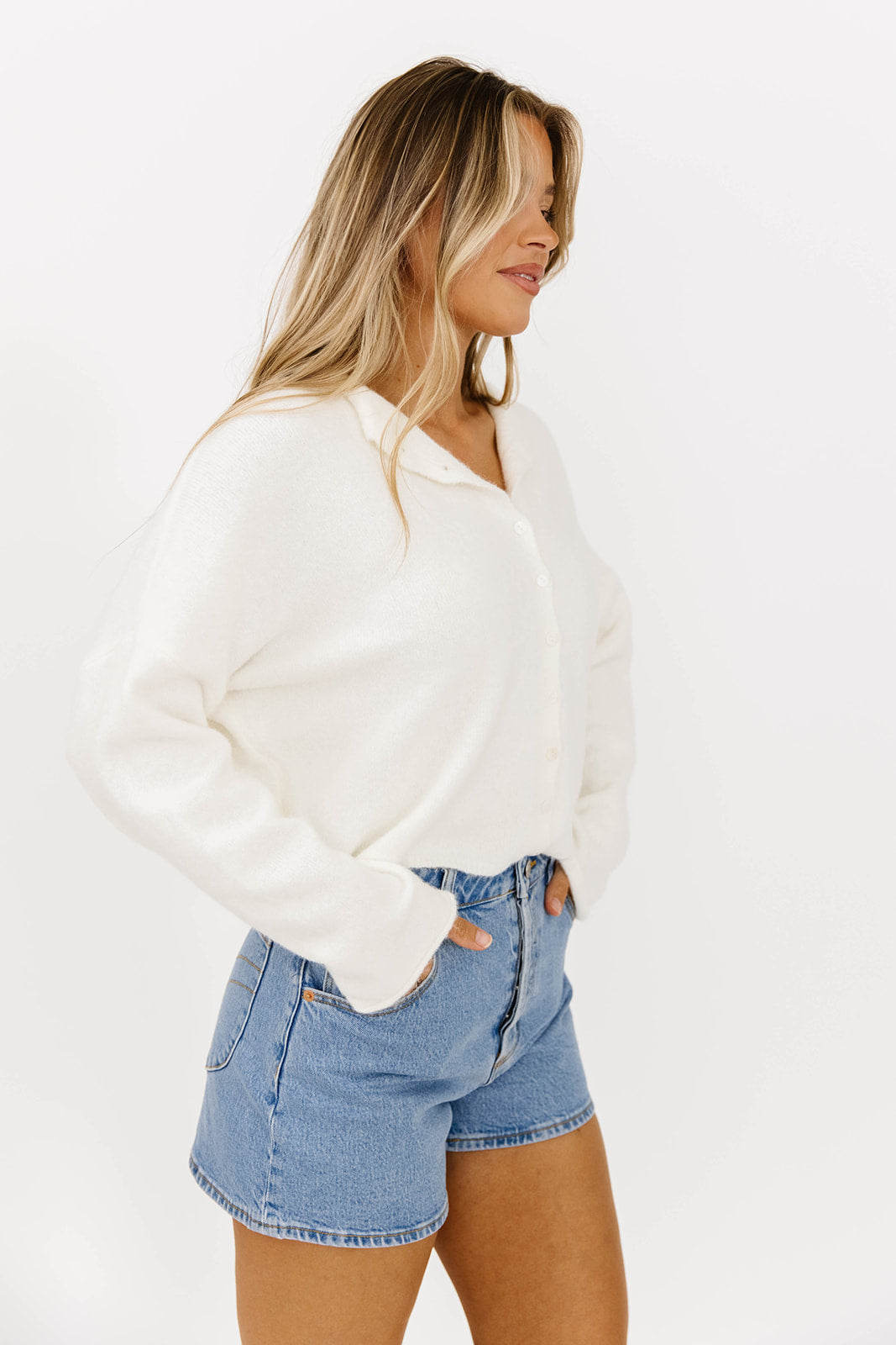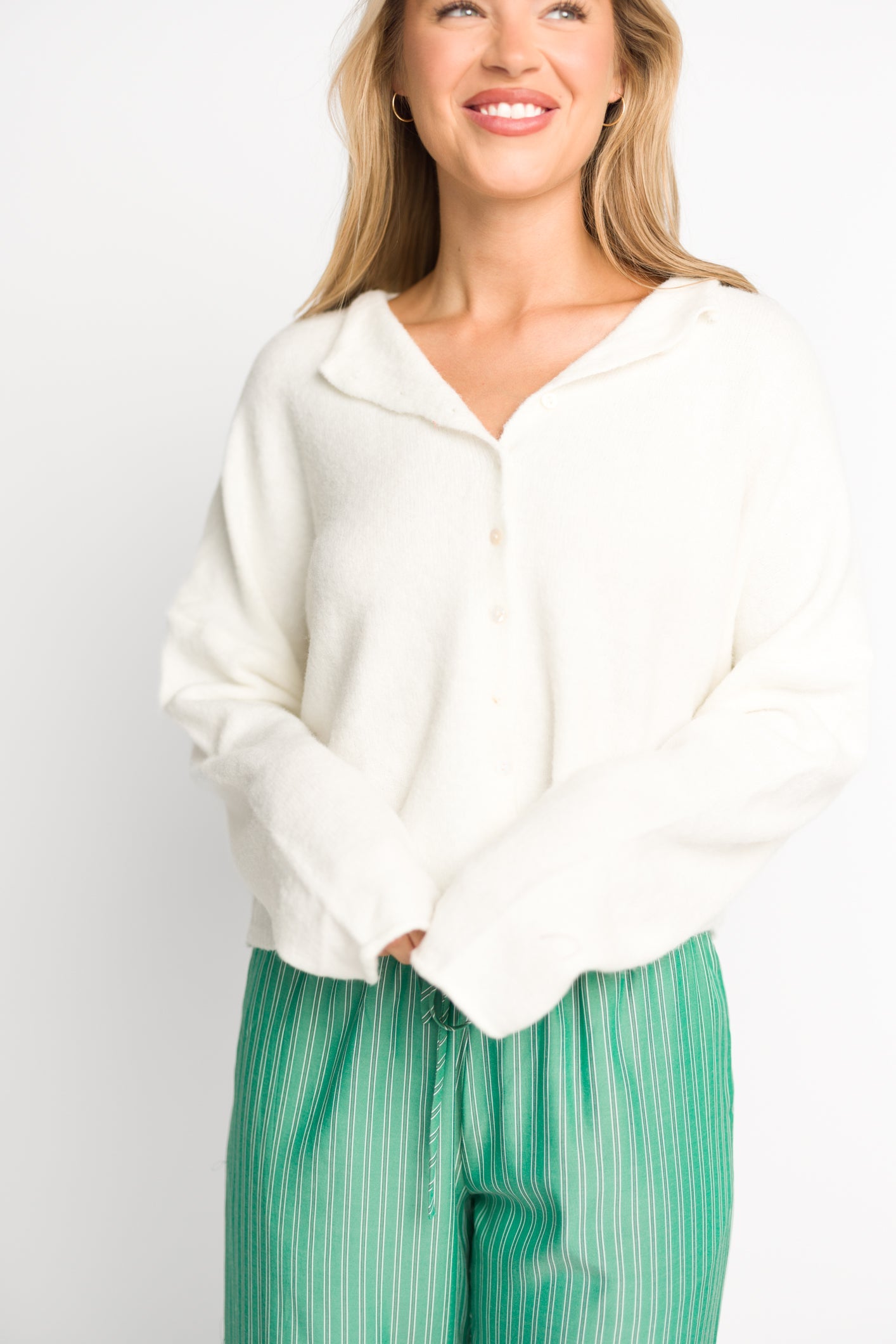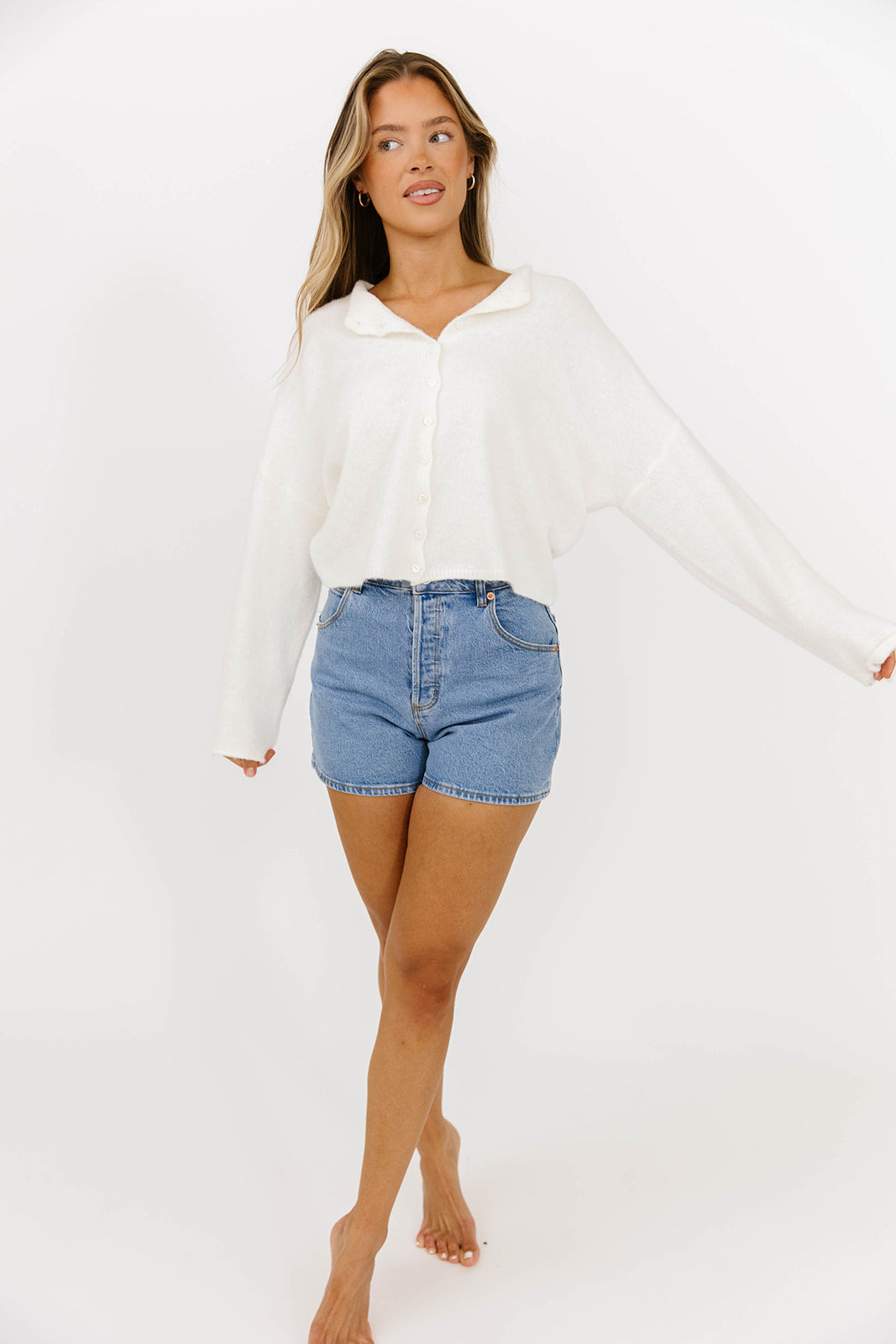 GARMENT DETAILS: Soft and feminine cardigan with long sleeves and rolled hem. Features dainty button front closure.