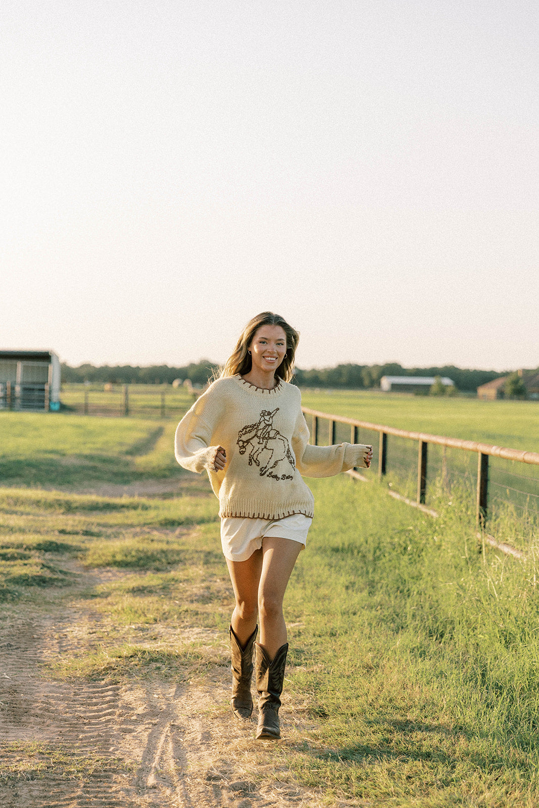 GARMENT DETAILS: Midweight knit sweater with high crewneck, dropped shoulders, and long sleeves. Features contrast color stitching, with front cowboy and Lucky Baby embroidery.