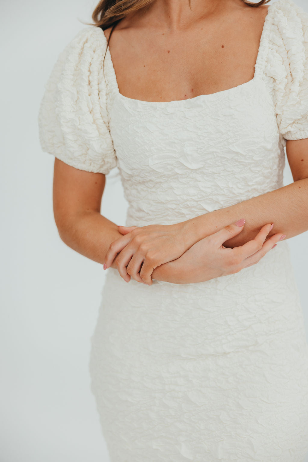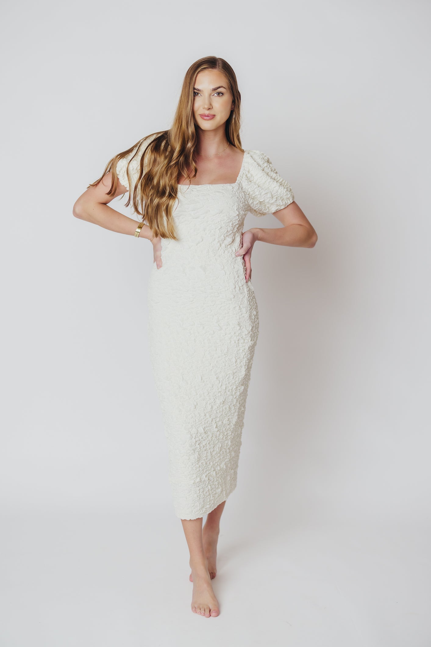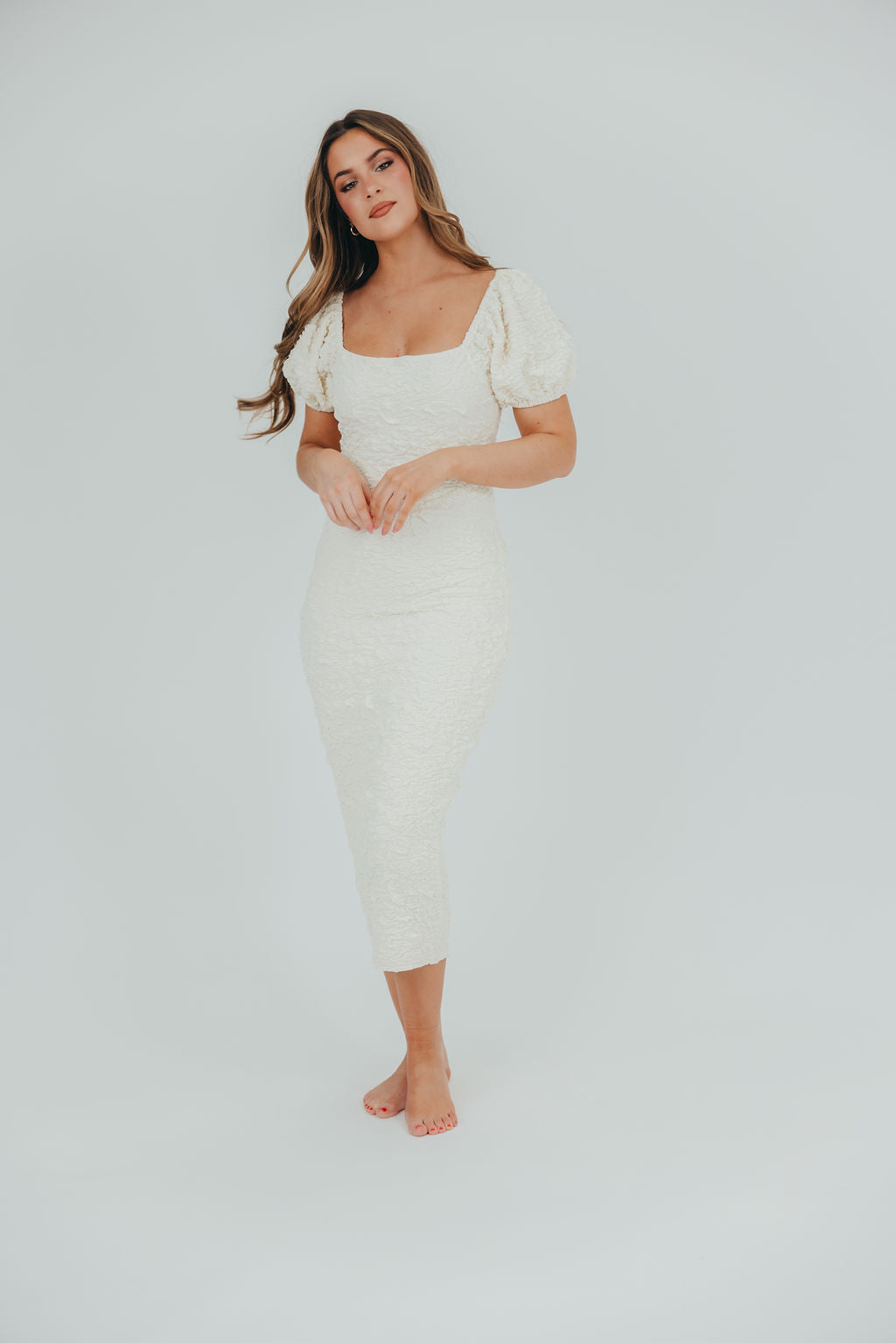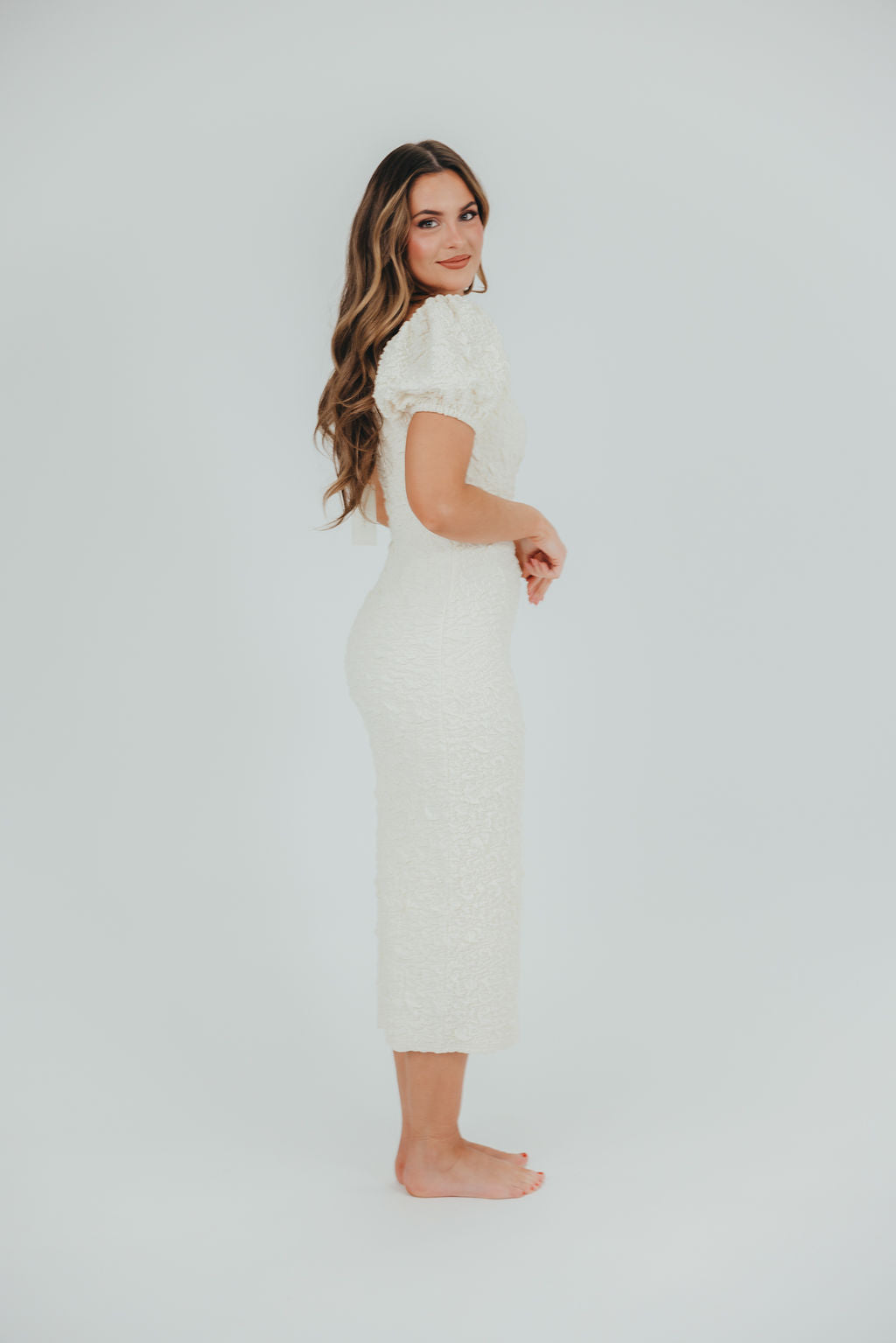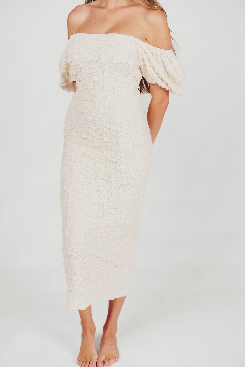 Blakeley Textured Midi Dress in Ivory - Bump Friendly & Inclusive Sizing (S-3XL)