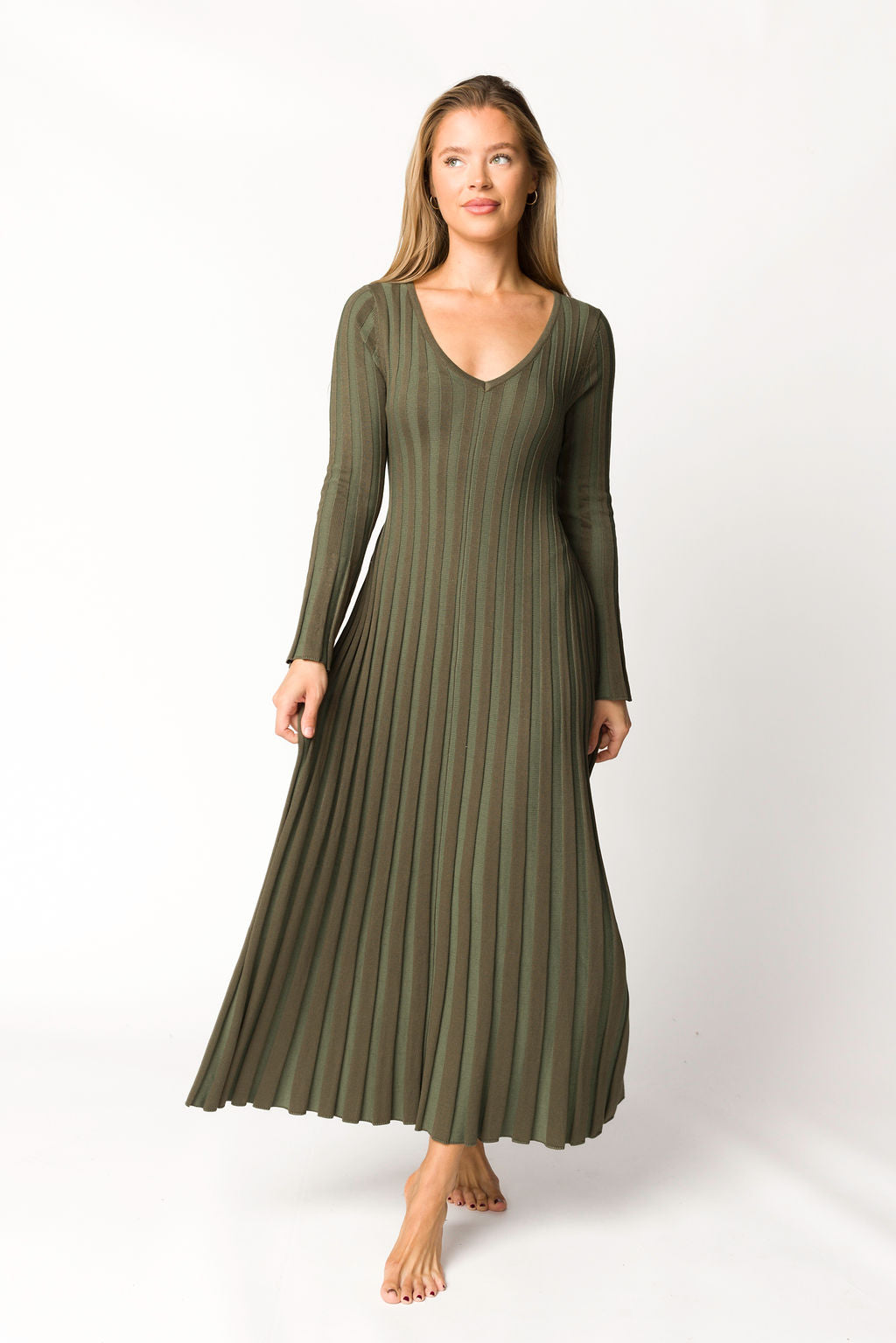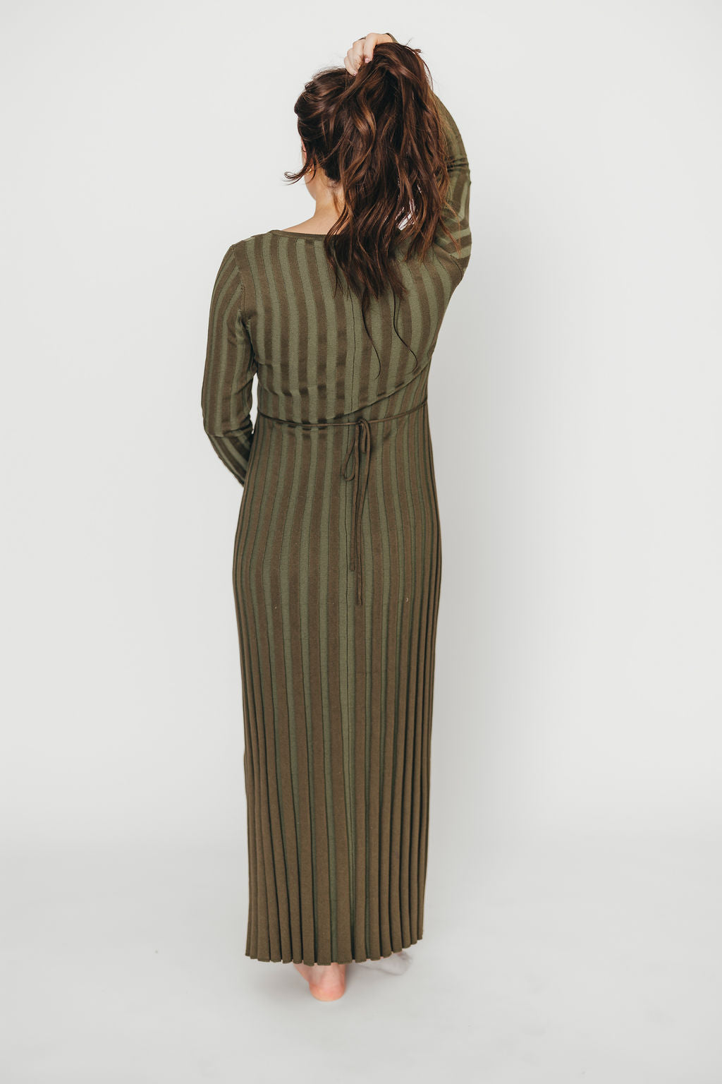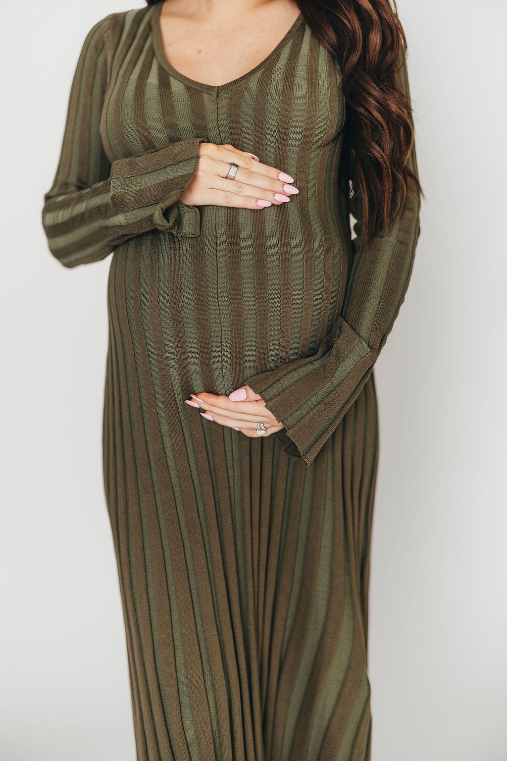 Hadley Long Sleeve V-Neck Knit Maxi Dress in Olive- Bump Friendly