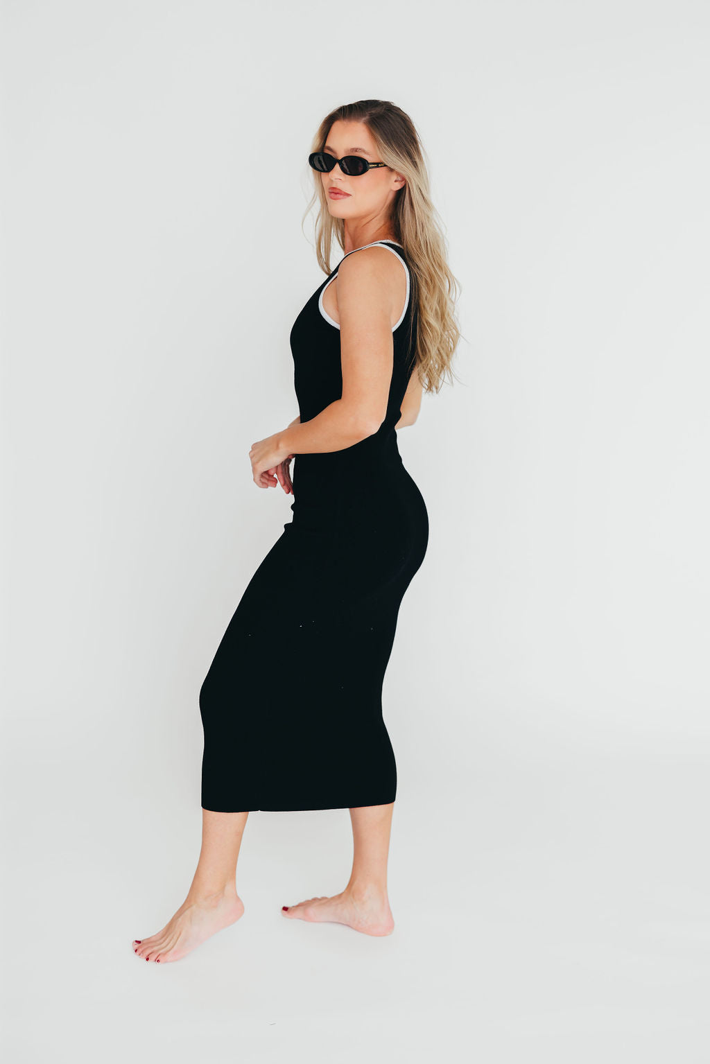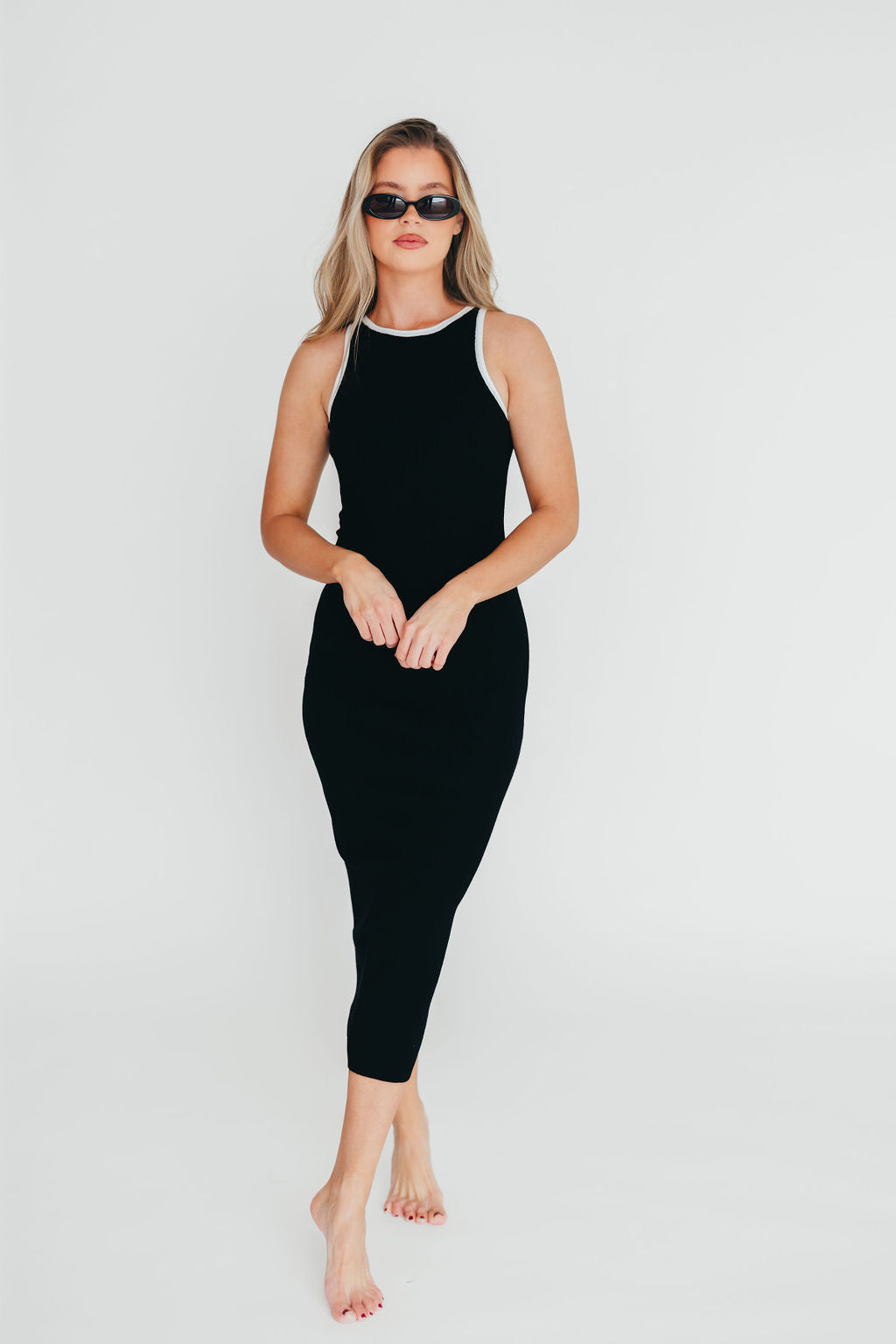 GARMENT DETAILS: Fitted tank dress in a long midi length, with scooped neckline, racerback detail, with contrast color edging.