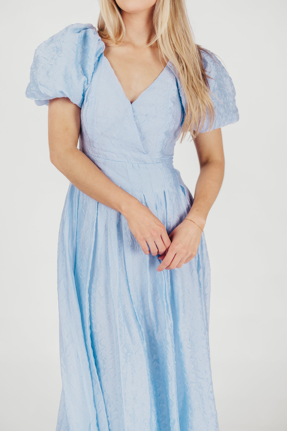 GARMENT DETAILS: Short-sleeved midi dress in a lightweight jacquard fabric. Features a smocked back panel, with concealed zipper closure and self-tie sash. Includes a front hook closure at the bust, and statement puffed sleeves. Lined.