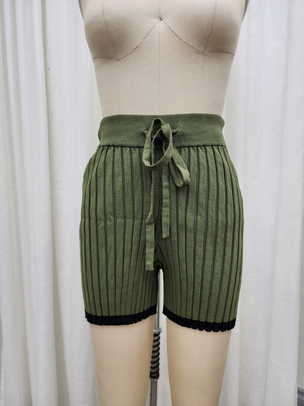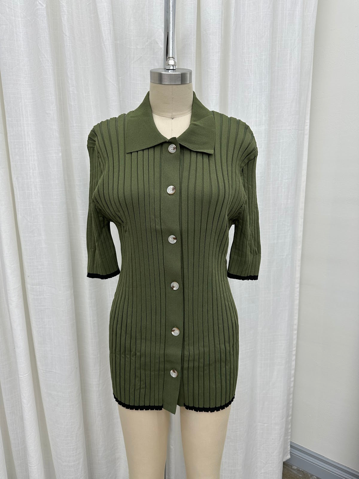 GARMENT DETAILS: Midweight thick ribbed knit cardigan top and shorts set. Top features extra long length, with collared neckline, 1/2 length fitted sleeves, and a fully functional front button placket. Shorts feature elasticated waistband and drawstring. Both pieces have contrast color hem binding.