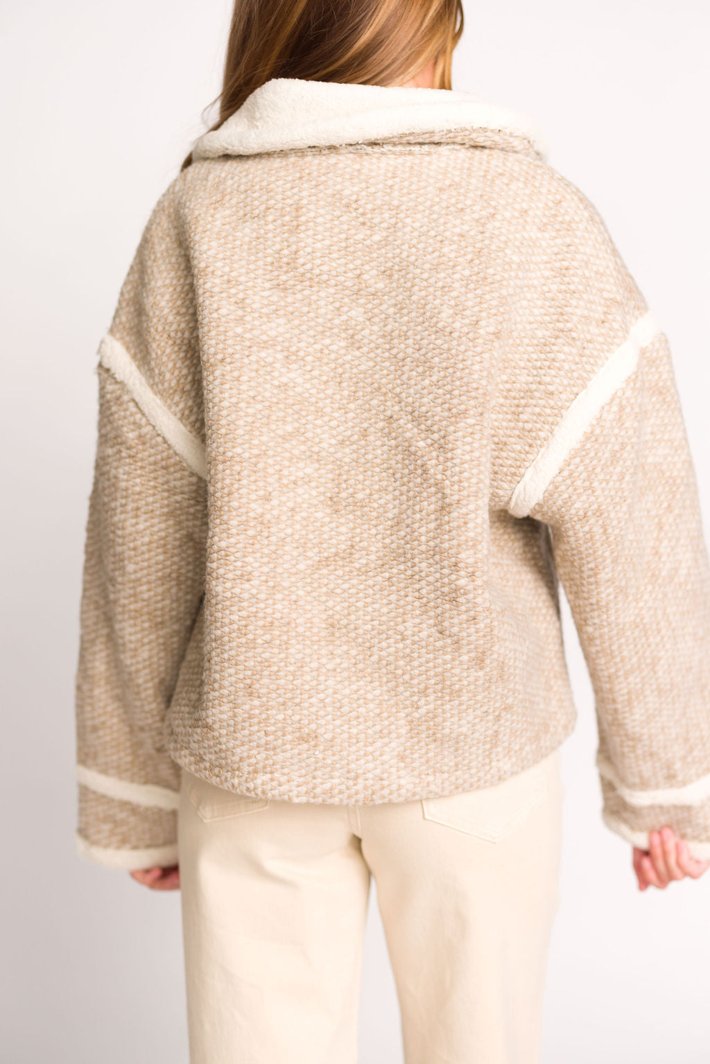 Beige has never looked better! This comfy cozy jacket arrives just in time for cooler weather; you'll love its spread collar, fluffy shearling accents, and warm color combination. Pair it with your favorite athleisure set for a fun little outfit!