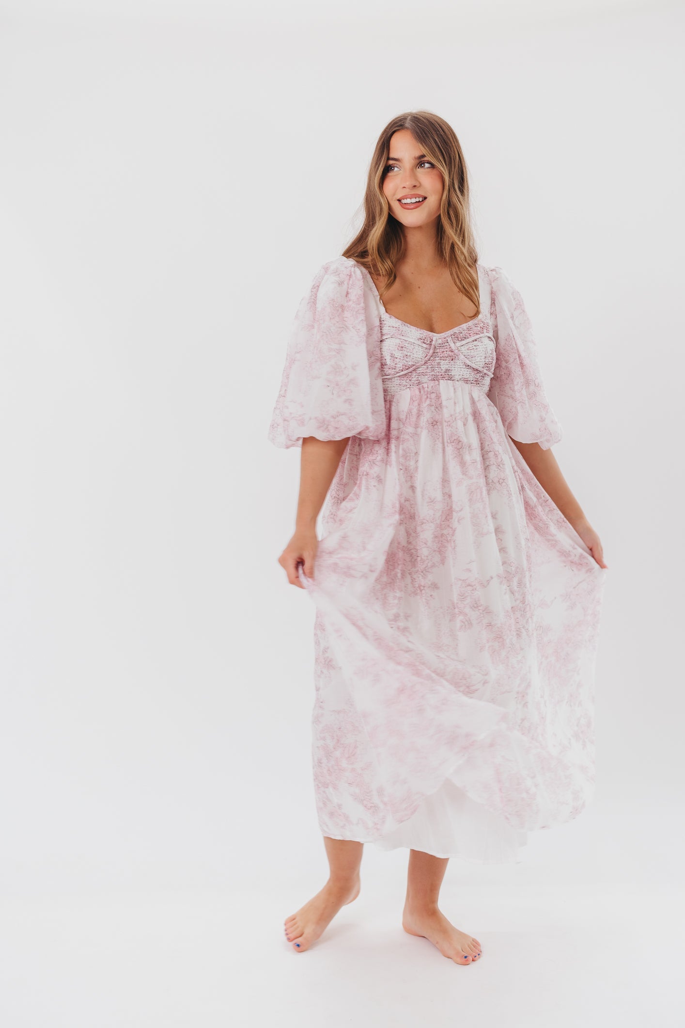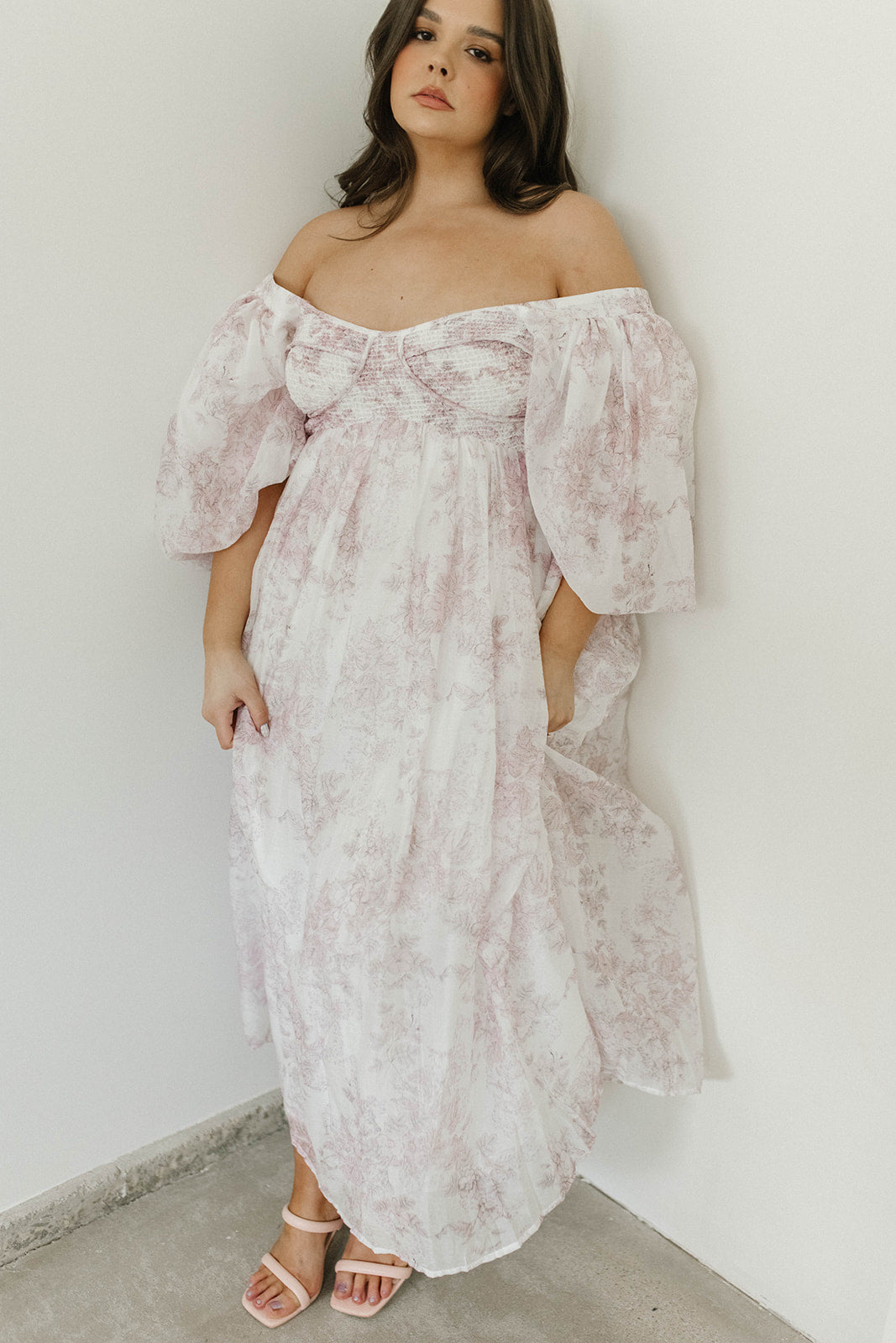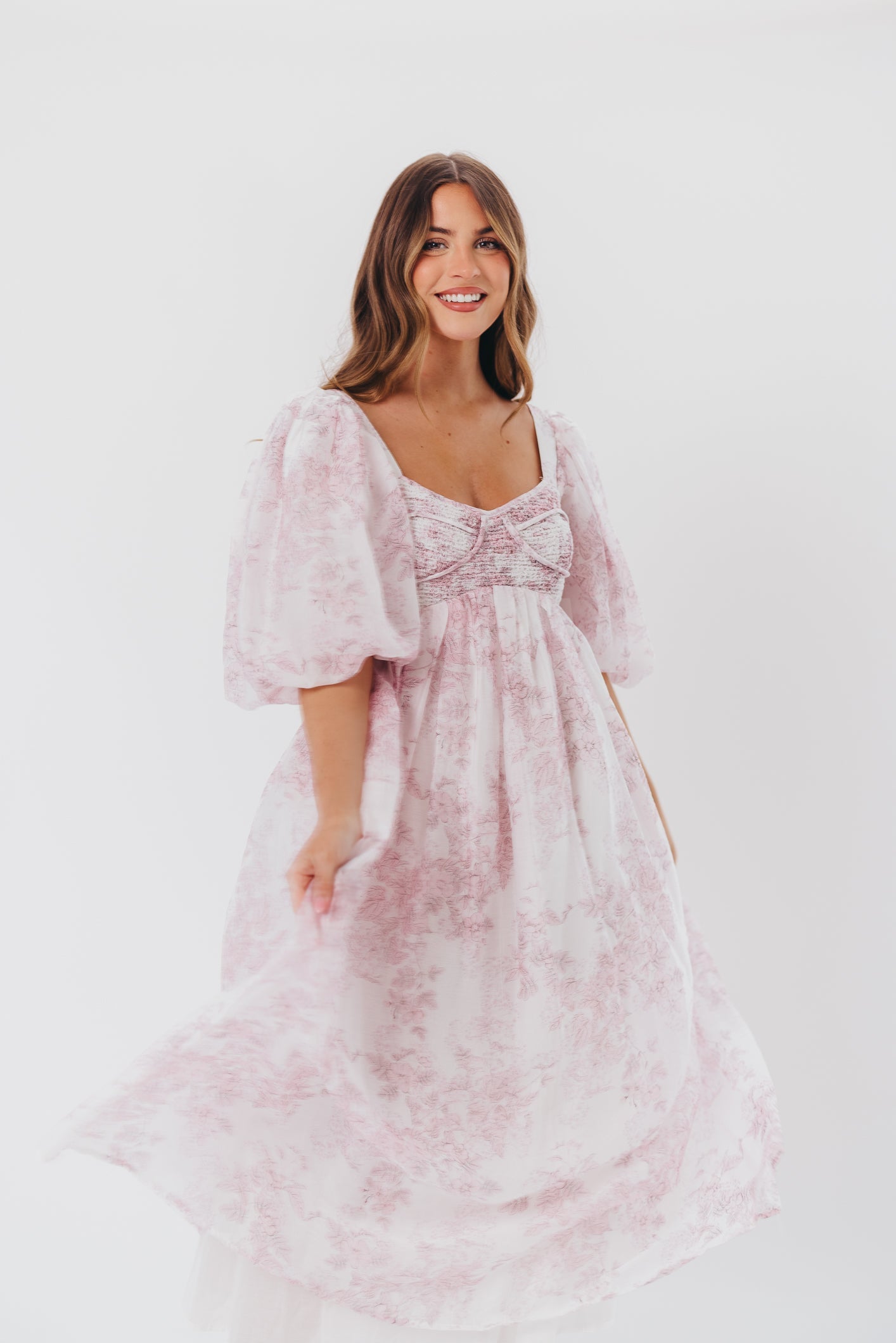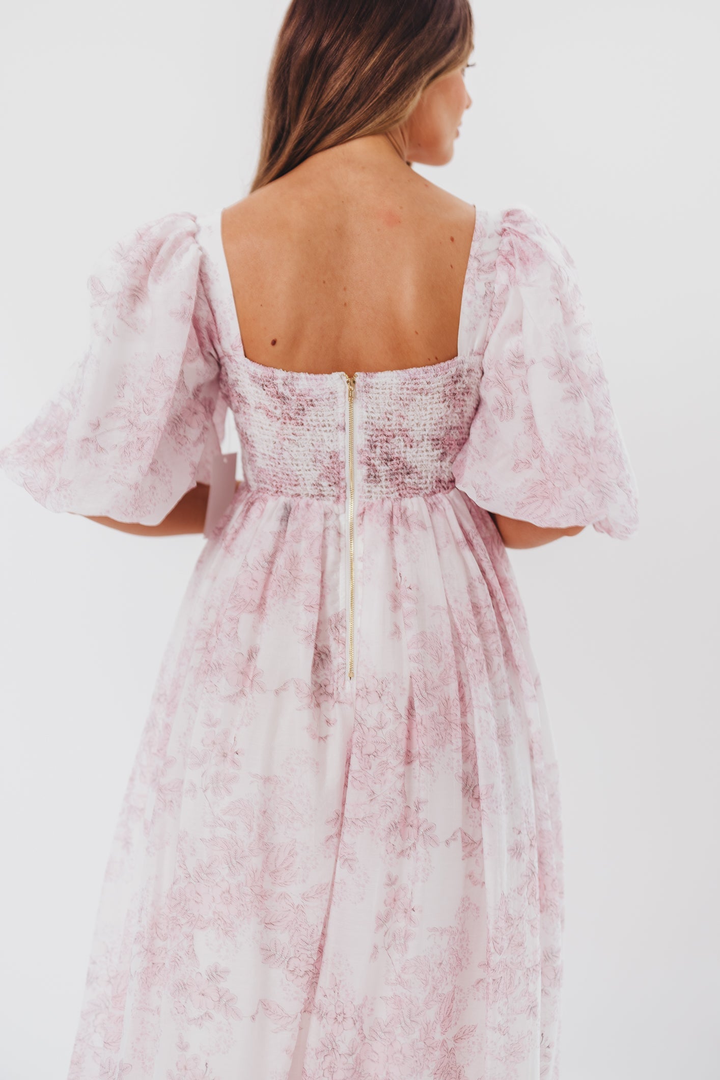 GARMENT DETAILS: Lightweight maxi in a pastel floral print. Features an empire waist silhouette and structured bustier-style bodice, with smocking in the back. Finished with statement puffed sleeves, voluminous skirt, and back zipper. Lined.