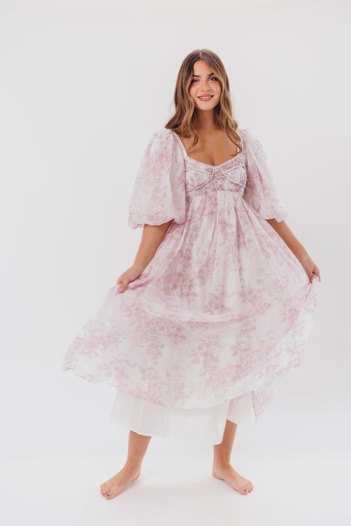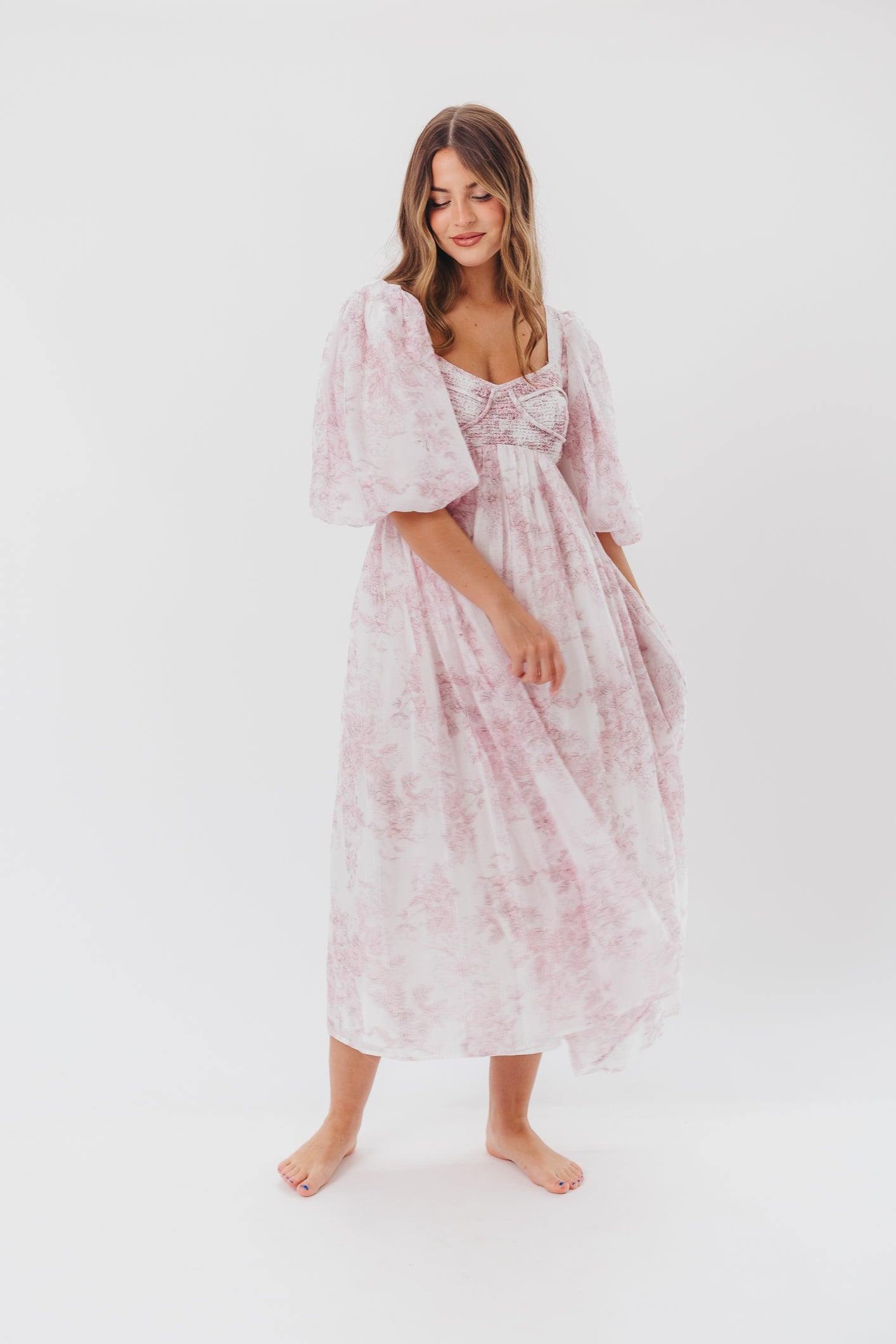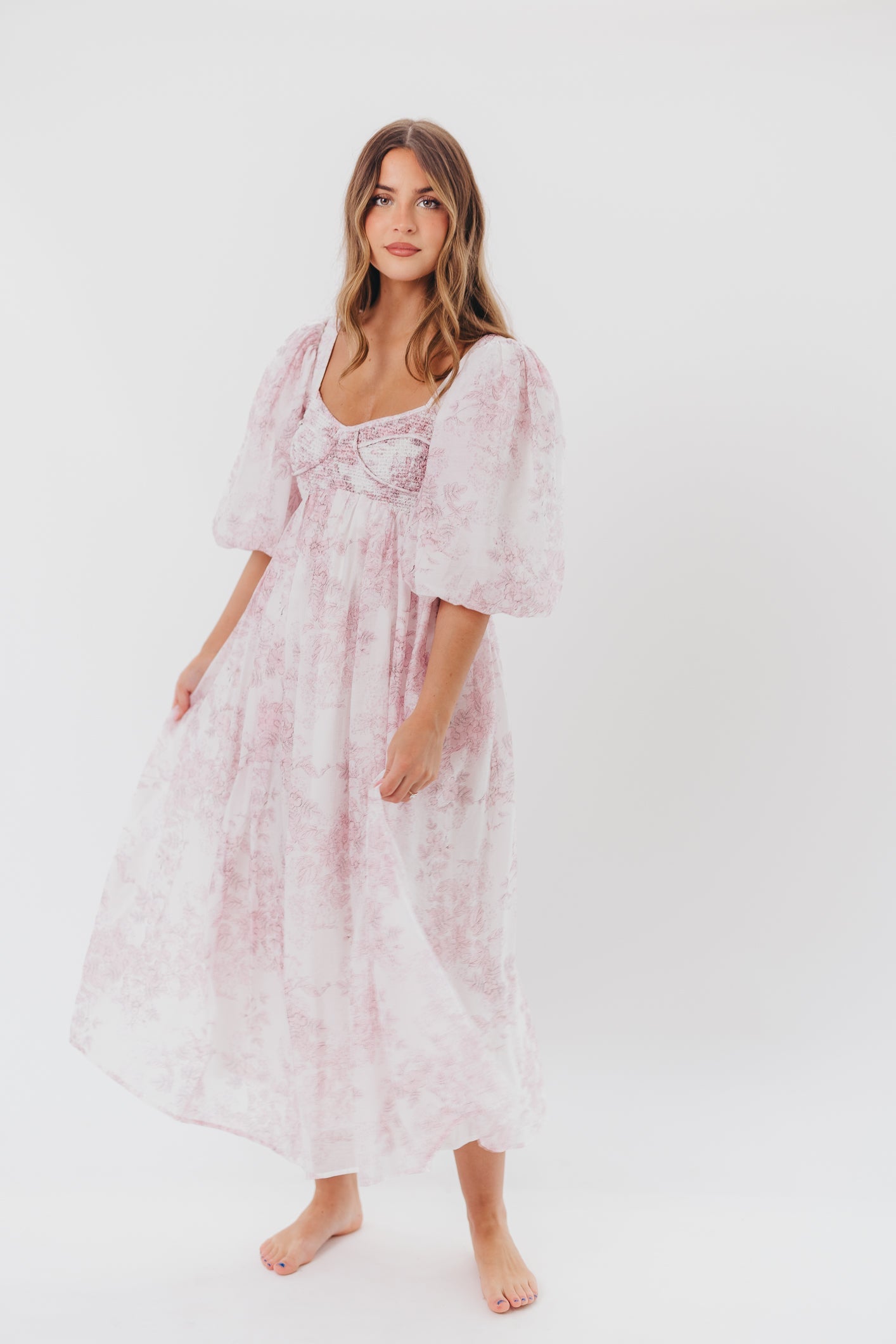 GARMENT DETAILS: Lightweight maxi in a pastel floral print. Features an empire waist silhouette and structured bustier-style bodice, with smocking in the back. Finished with statement puffed sleeves, voluminous skirt, and back zipper. Lined.