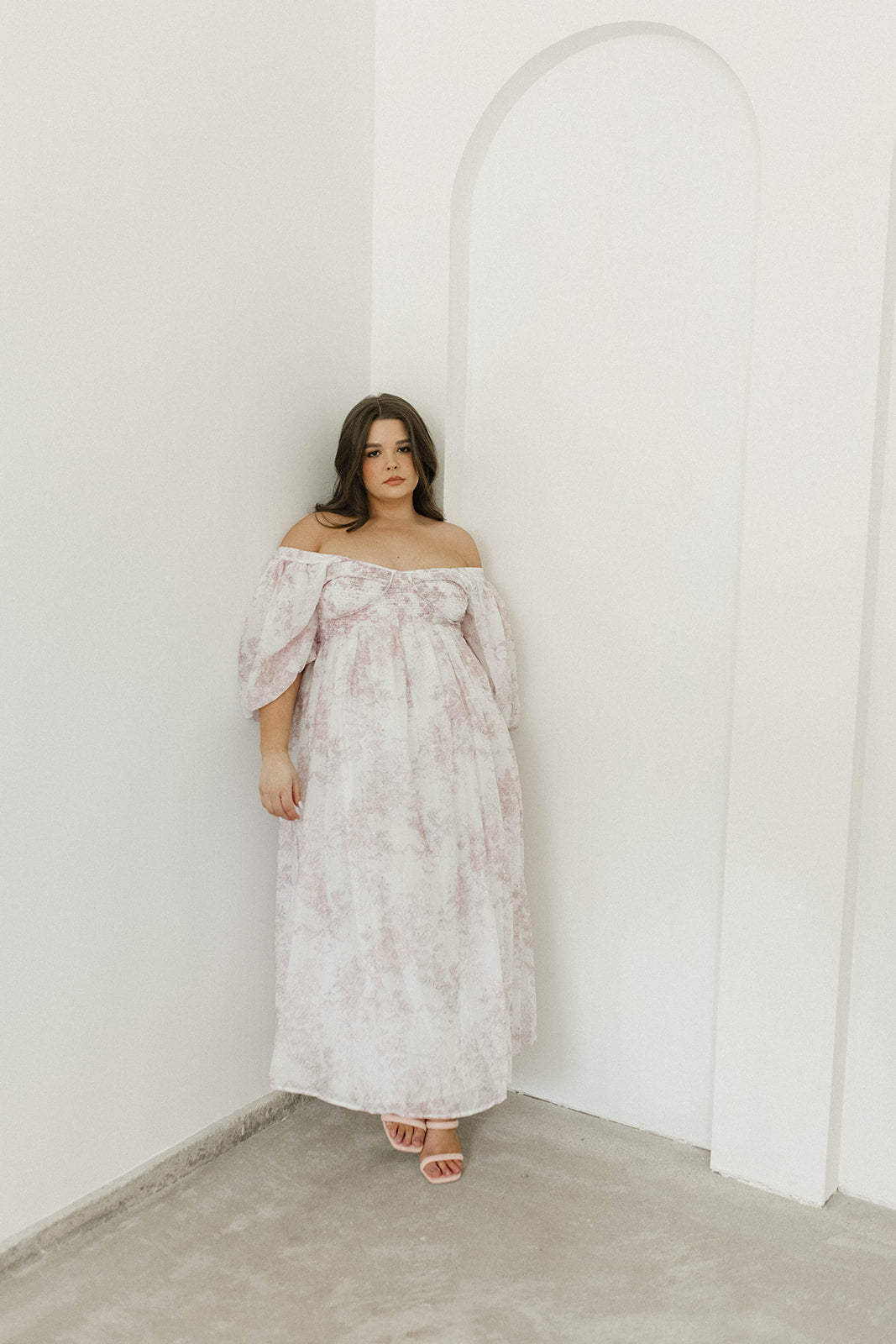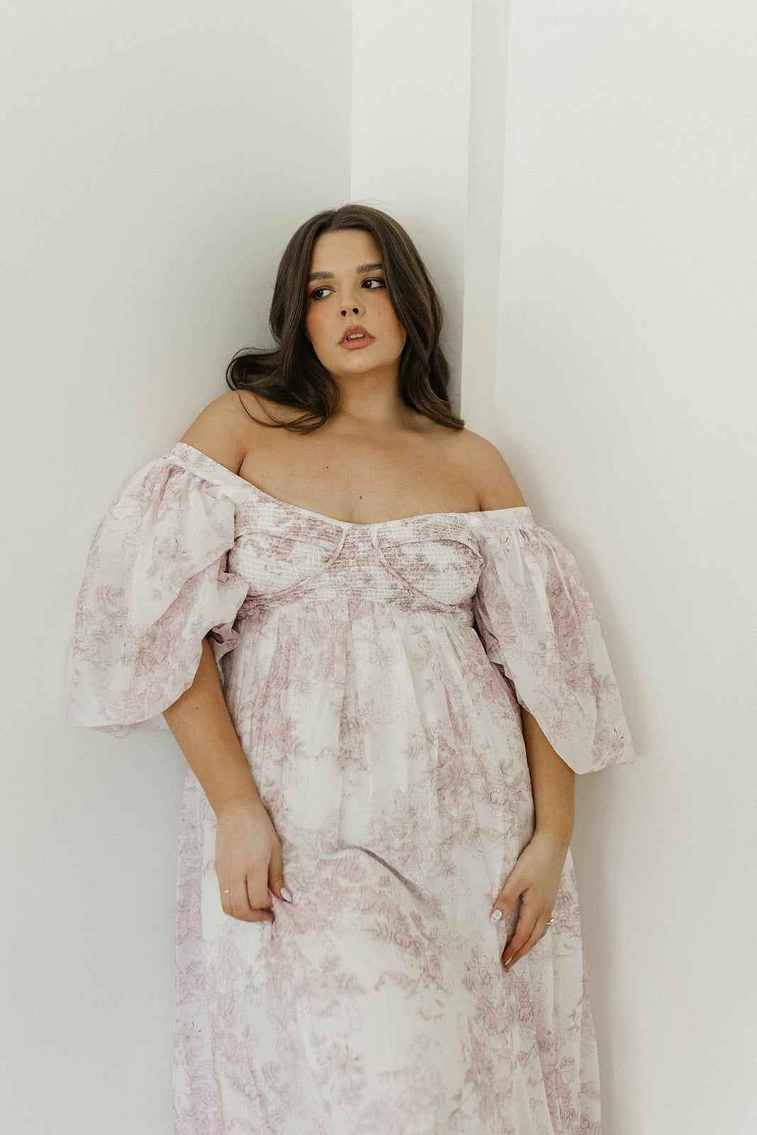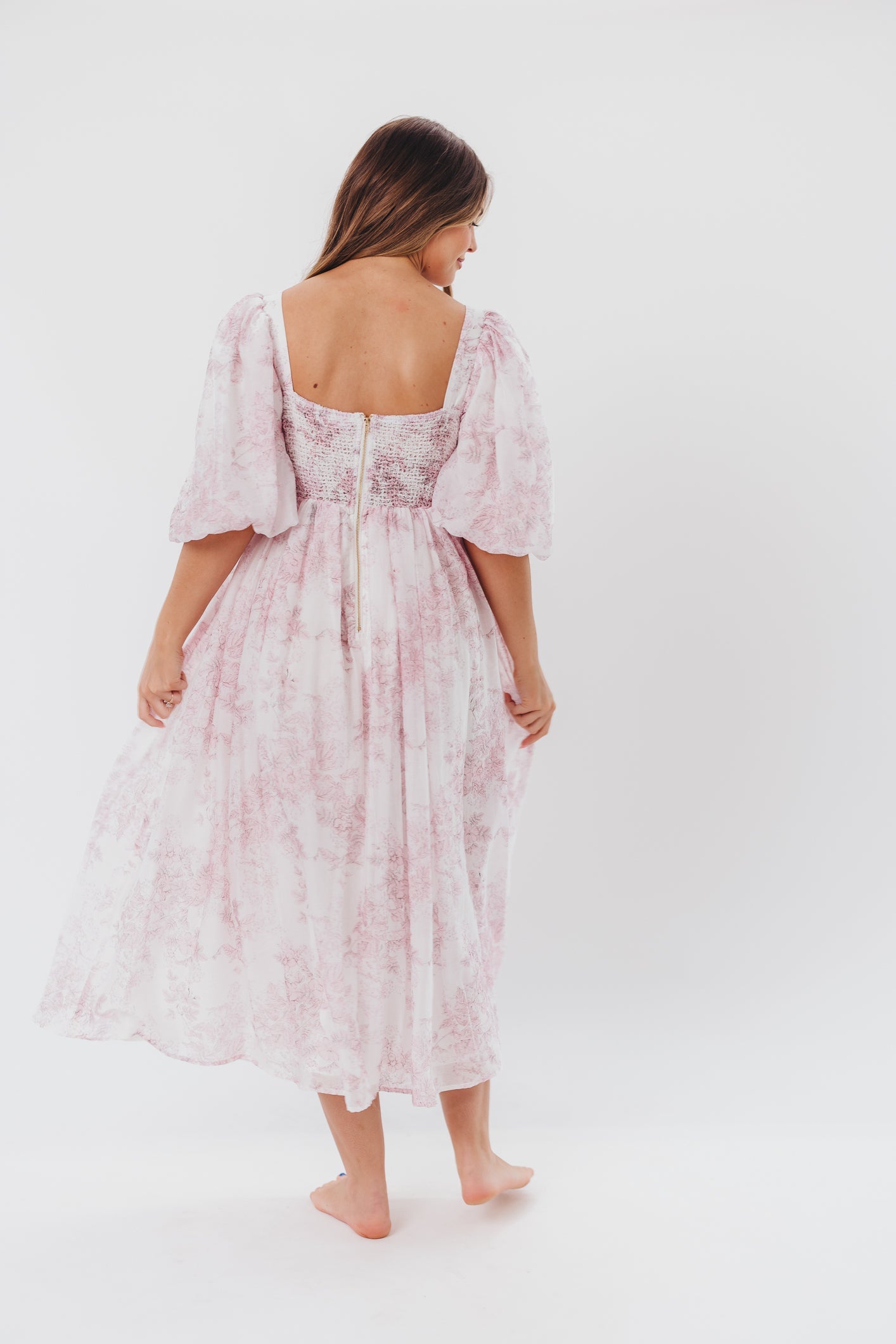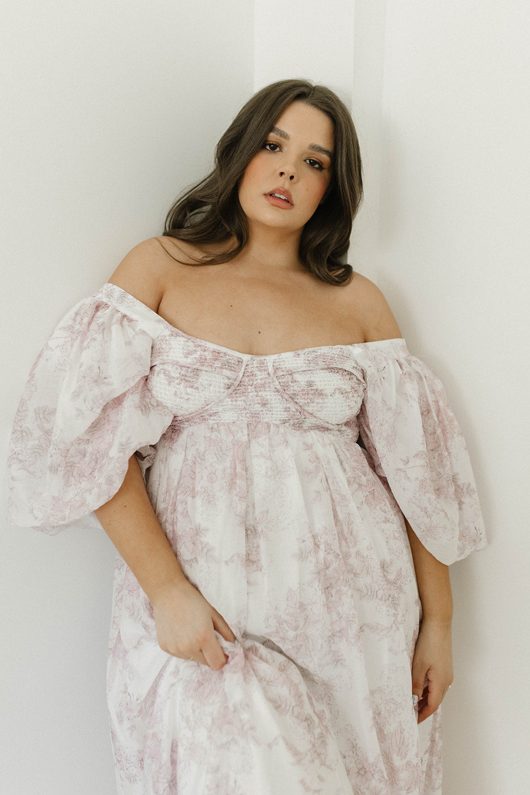 GARMENT DETAILS: Lightweight maxi in a pastel floral print. Features an empire waist silhouette and structured bustier-style bodice, with smocking in the back. Finished with statement puffed sleeves, voluminous skirt, and back zipper. Lined.