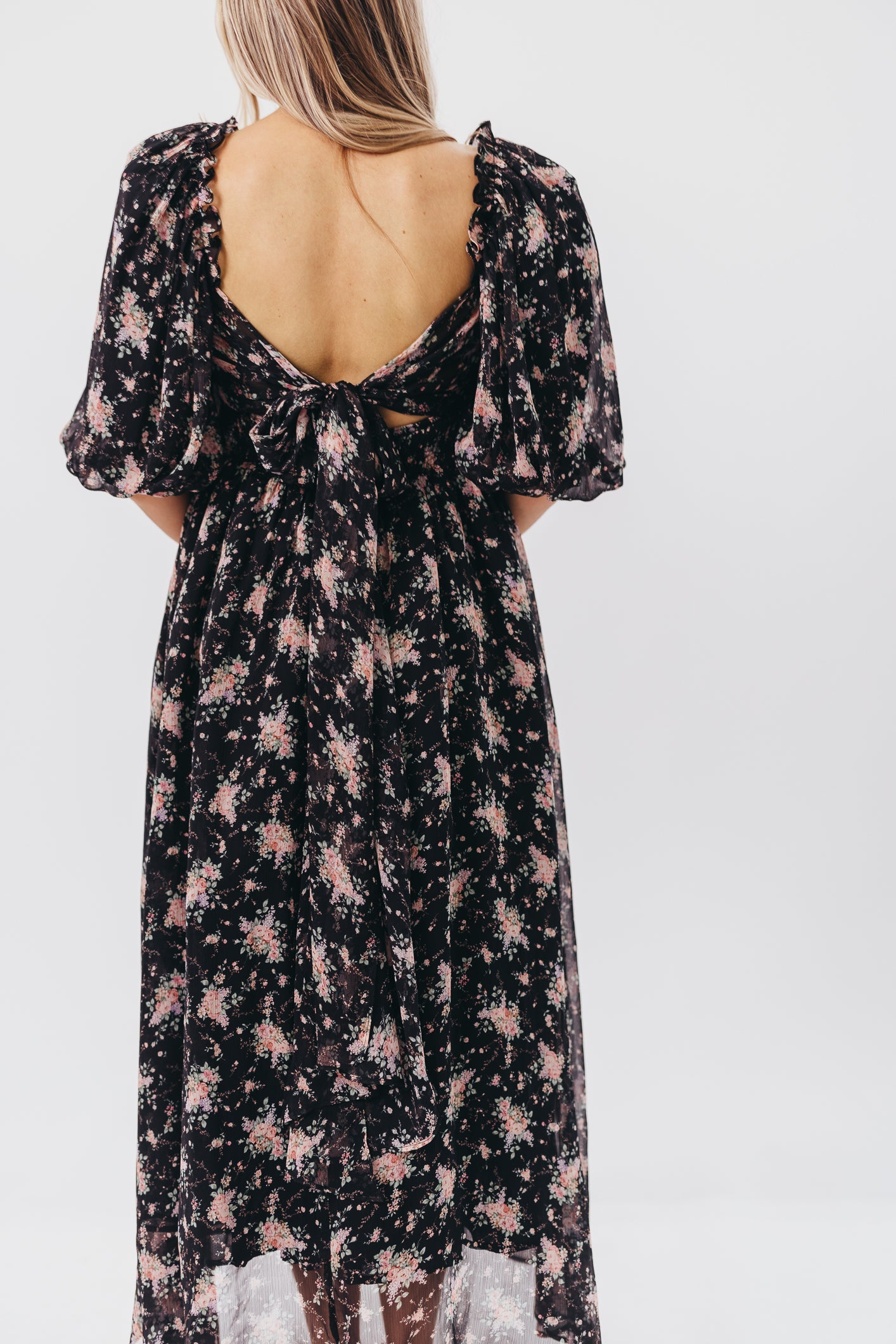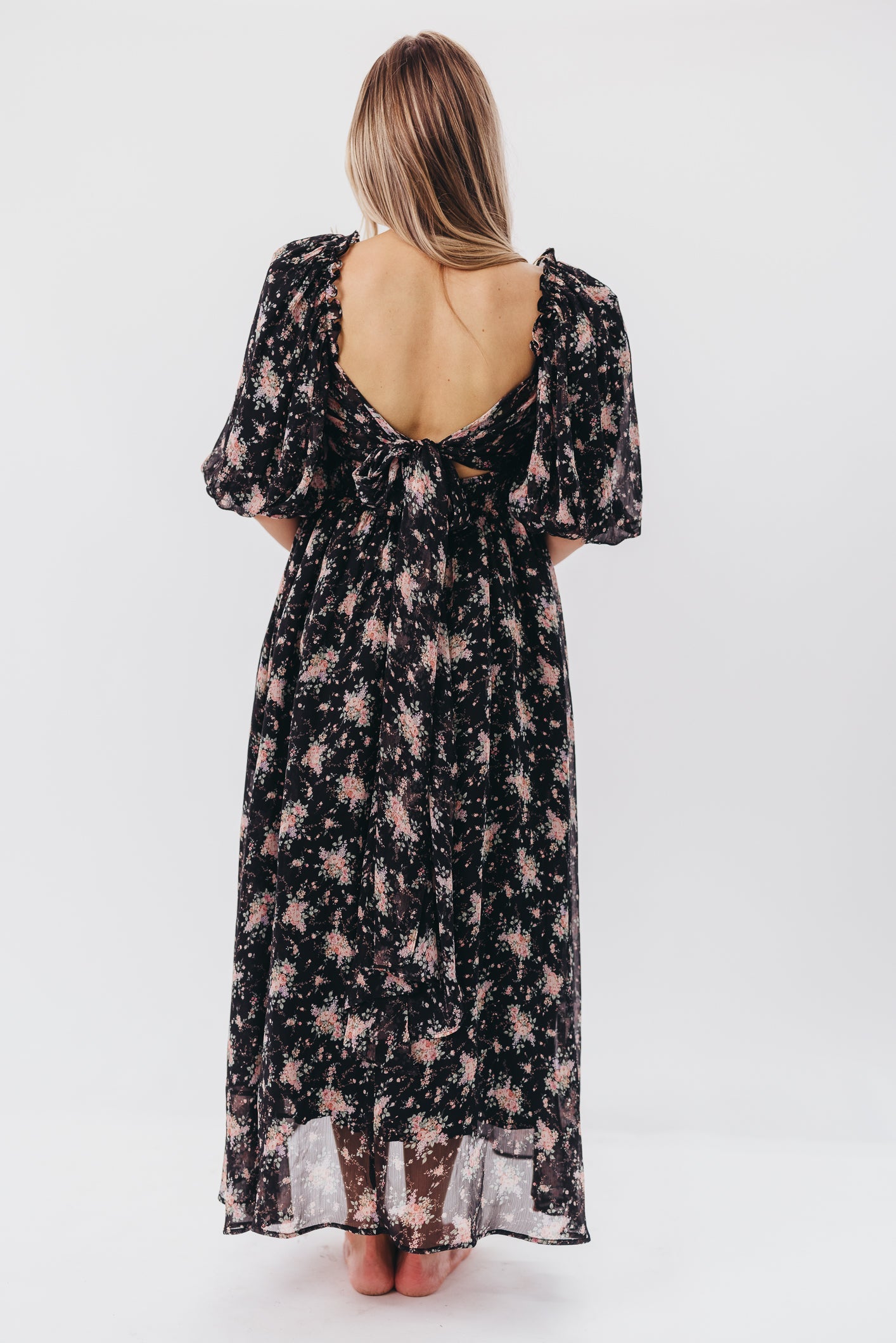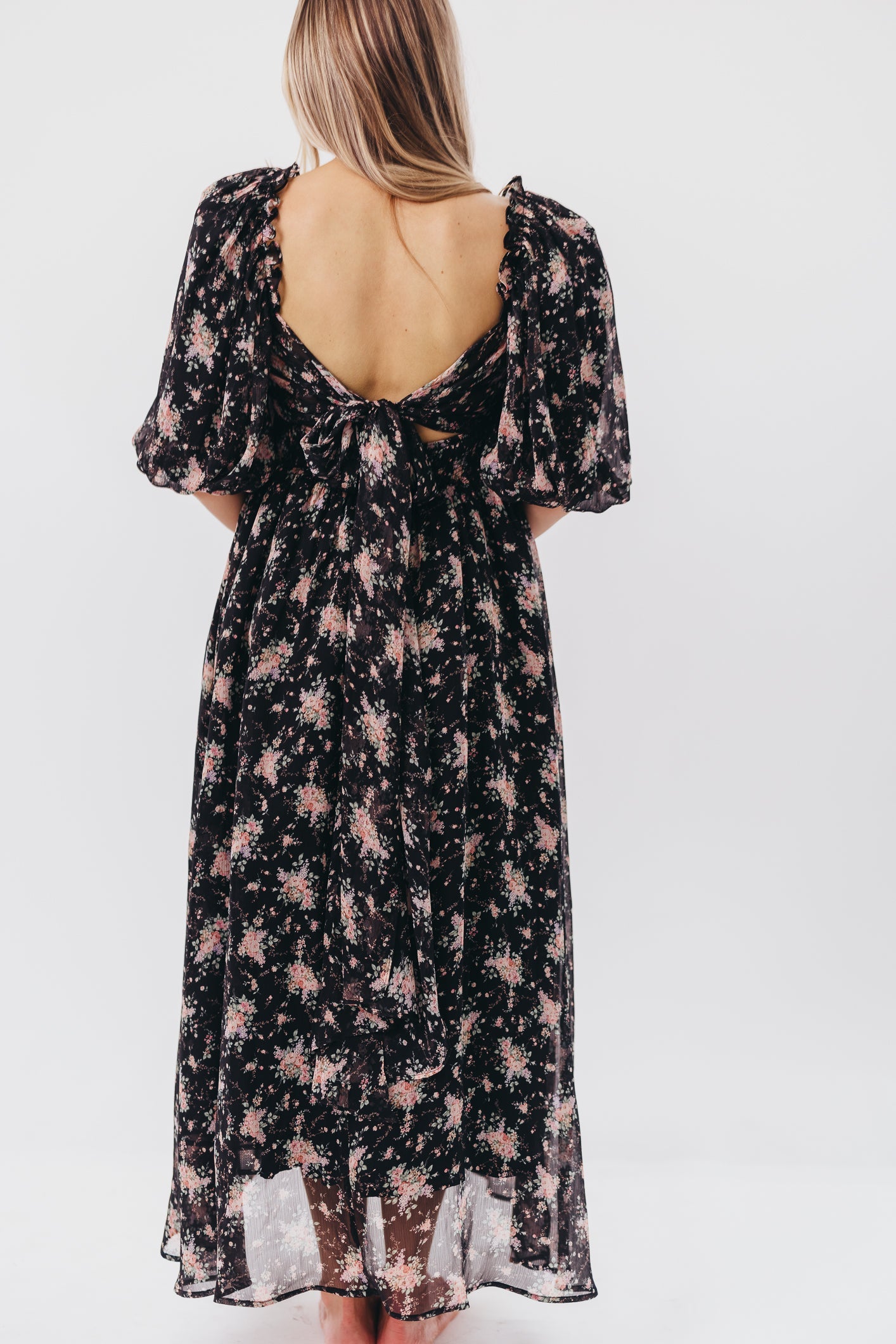 GARMENT DETAILS: Maxi dress with empire waist silhouette, square neckline, and pleated bodice with smocked back panel. Finished with 1/2 length balloon sleeves that can be worn on or off the shoulder, and a low, dramatic back with self-tie bow detail.