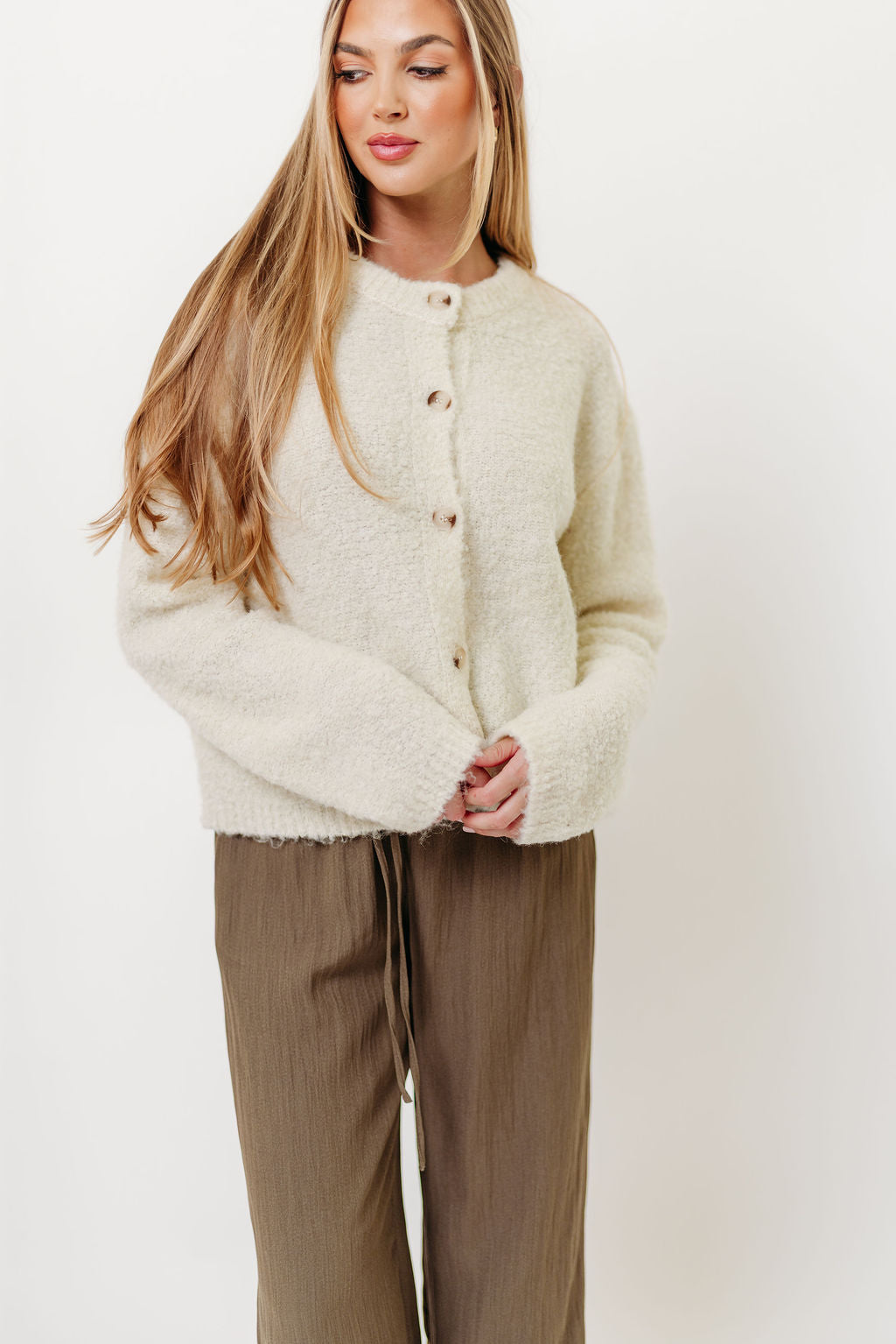 GARMENT DETAILS: Soft classic knit cardigan with rounded neckline, long sleeves, and dainty front button placket.
