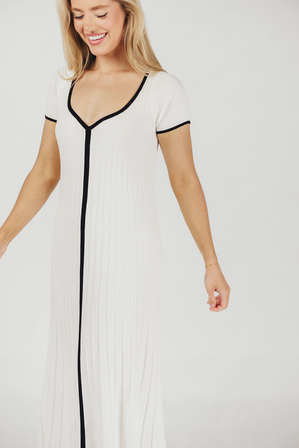 GARMENT DETAILS: Lightweight knit maxi dress with a plunging V-neckline, short cap sleeves, and a loose, pleated skirt. Features contrast color binding throughout.