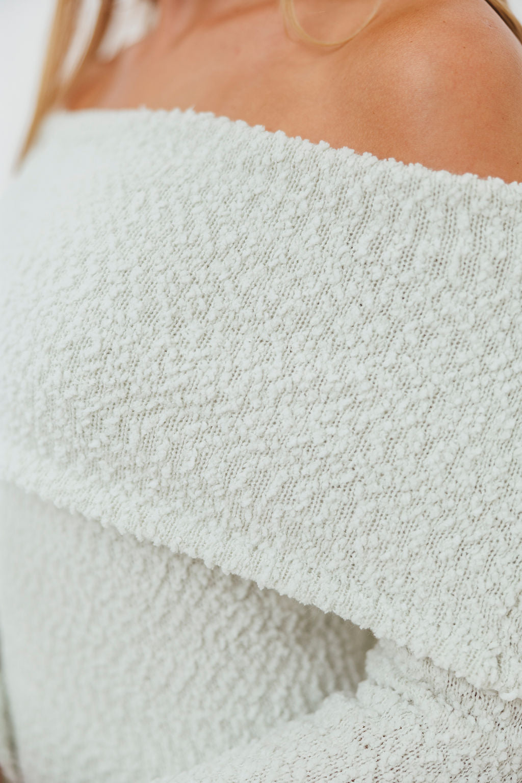 GARMENT DETAILS: Gorgeous chenille-like knit maxi dress with folded off-the-shoulder neckline, flared long sleeves, and a fit-and-flare skirt. Features a full lining (neck to hem) but still very lightweight.